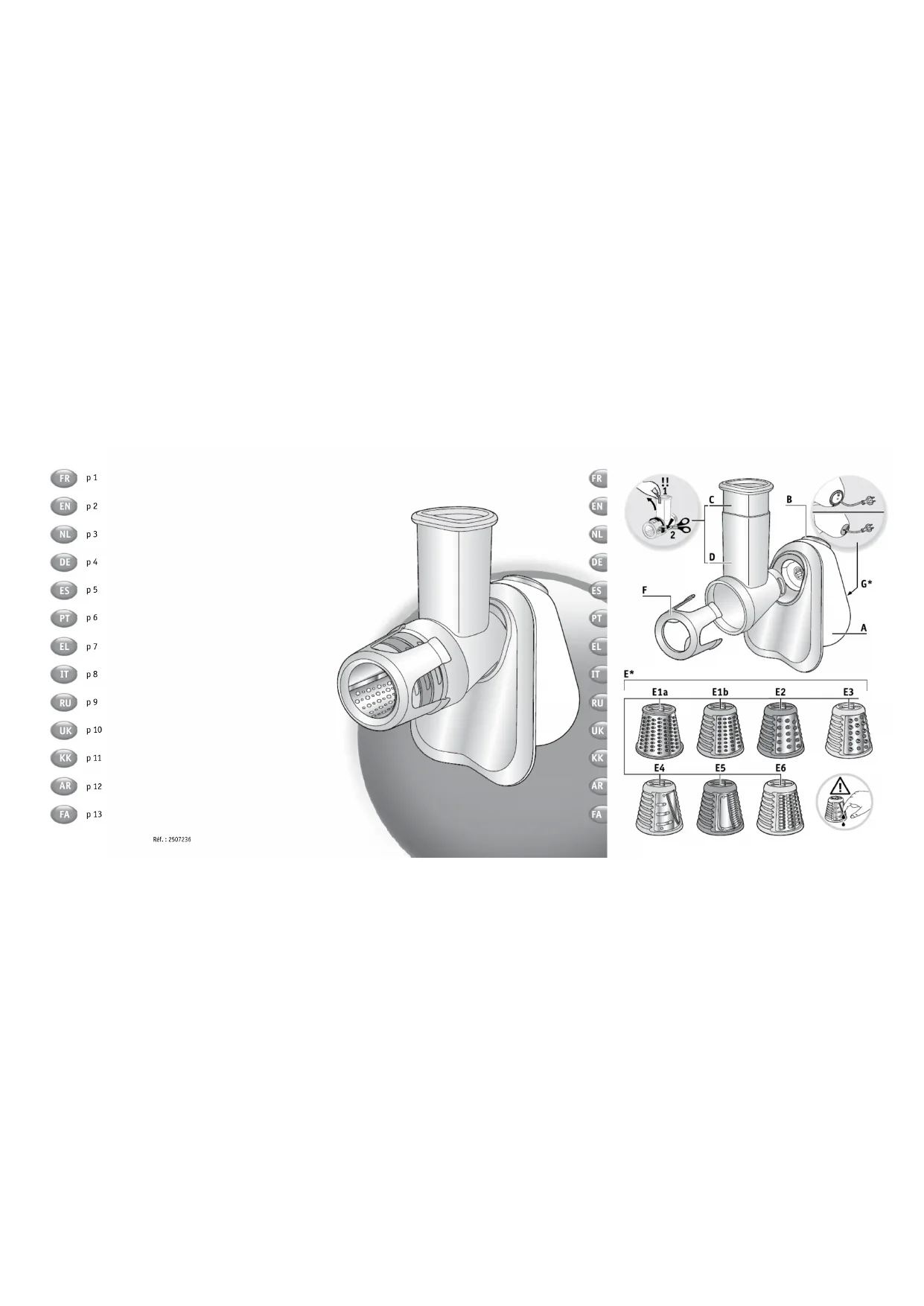 A Bloc moteur B Bouton marche / arrêt C Poussoir D Magasin à cônes / cheminée E* Cônes (selon modèle) E1a Cône Râpé fin (métal) E1b Cône râpé fin (métal/plastique orange) E2 Cône Râpé épais (rouge) E3 Cône Gratté (jaune foncé) E4 Cône Tranché (vert clair) E5 Cône vichy (vert foncé) E6 Cône reibekuchen (jaune clair) F Accessoire de rangement G*Range-cordon (selon modèle) AVANT LA PREMIERE UTILISATION (CF. FIG. 1) UTILISATION (CF. FIG. 2 À 8)