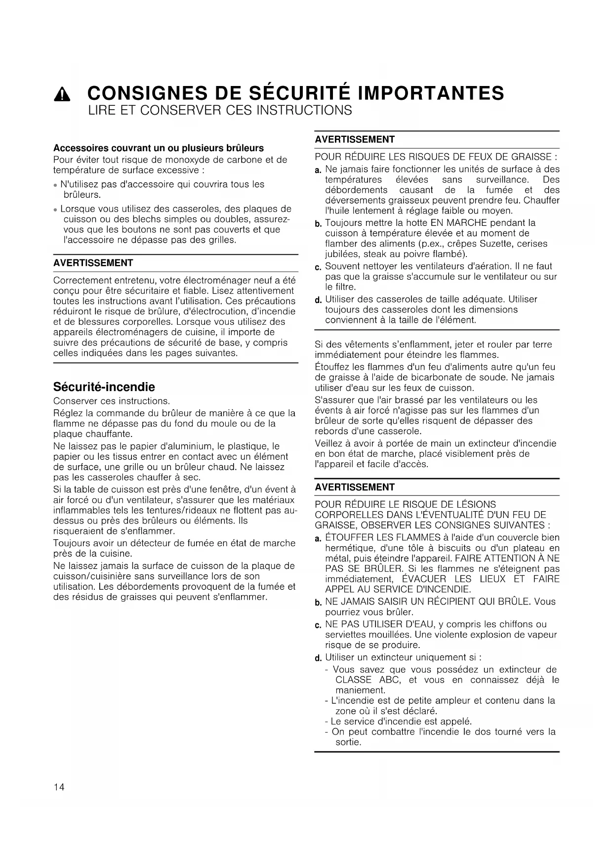 Utiliser des casseroles de taille adéquate. Utiliser toujours des casseroles dont les dimensions conviennent à la taille de l'élément. Si des vêtements s’enflamment, jeter et rouler par terre immédiatement pour éteindre les flammes. Étouffez les flammes d'un feu d'aliments autre qu'un feu de graisse à l'aide de bicarbonate de soude. Ne jamais utiliser d'eau sur les feux de cuisson. S'assurer que l'air brassé par les ventilateurs ou les évents à air forcé n'agisse pas sur les flammes d'un brûleur de sorte qu'elles risquent de dépasser des rebords d'une casserole. Veillez à avoir à portée de main un extincteur d'incendie en bon état de marche, placé visiblement près de l'appareil et facile d'accès. AVERTISSEMENT POUR RÉDUIRE LE RISQUE DE LÉSIONS CORPORELLES DANS L'ÉVENTUALITÉ D'UN FEU DE GRAISSE, OBSERVER LES CONSIGNES SUIVANTES :
