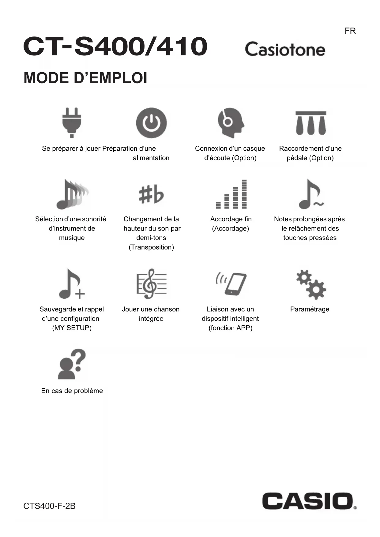 S400/410 Se préparer à jouer Préparation d’une alimentation Connexion d’un casque d’écoute (Option) Raccordement d’une pédale (Option) Sélection d’une sonorité d’instrument de musique Changement de la hauteur du son par demi-tons (Transposition) Accordage fin (Accordage) Notes prolongées après le relâchement des touches pressées Sauvegarde et rappel d’une configuration (MY SETUP) Jouer une chanson intégrée Liaison avec un dispositif intelligent (fonction APP) Paramétrage En cas de problème CouvertureFR-1 ■ À propos des données de partitions de musique Vous pouvez télécharger les données des partitions musicales sous forme de fichier PDF sur le site Internet CASIO. Vous pourrez alors voir les partitions de musique sur votre dispositif intelligent. À partir du fichier de la table des matières vous pouvez accéder directement à la partition de musique que vous souhaitez et imprimer des partitions si vous le souhaitez. https://support.casio.com/global/fr/emi/manual/CT-S400/ Accessoires fournis et optionnels N’utilisez que les accessoires spécifiés pour ce clavier numérique. L’utilisation d’accessoires non autorisés crée un risque d’incendie, de choc électrique et de blessure.
