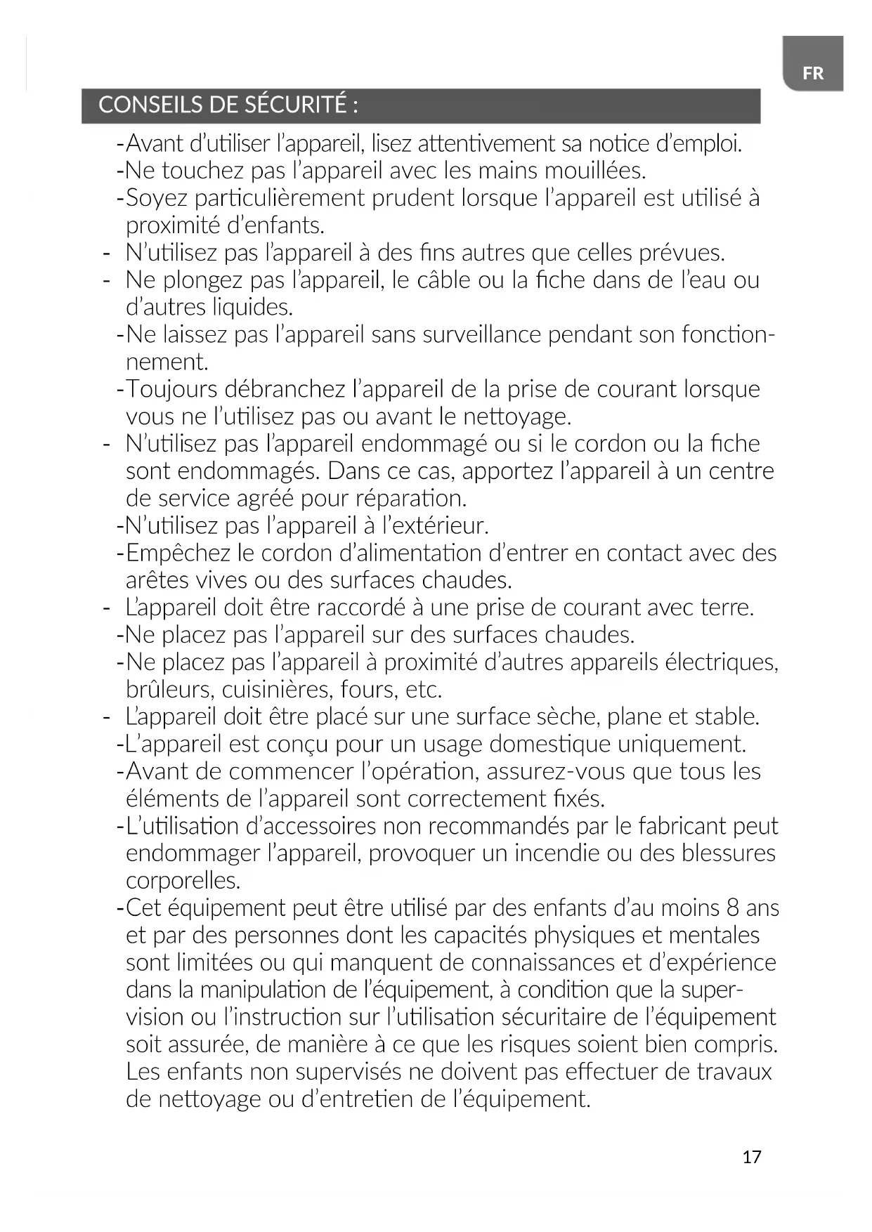 Ne placez pas l’appareil à proximité d’autres appareils électriques, brûleurs, cuisinières, fours, etc. - L’appareil doit être placé sur une surface sèche, plane et stable. - L’appareil est conçu pour un usage domesque uniquement.