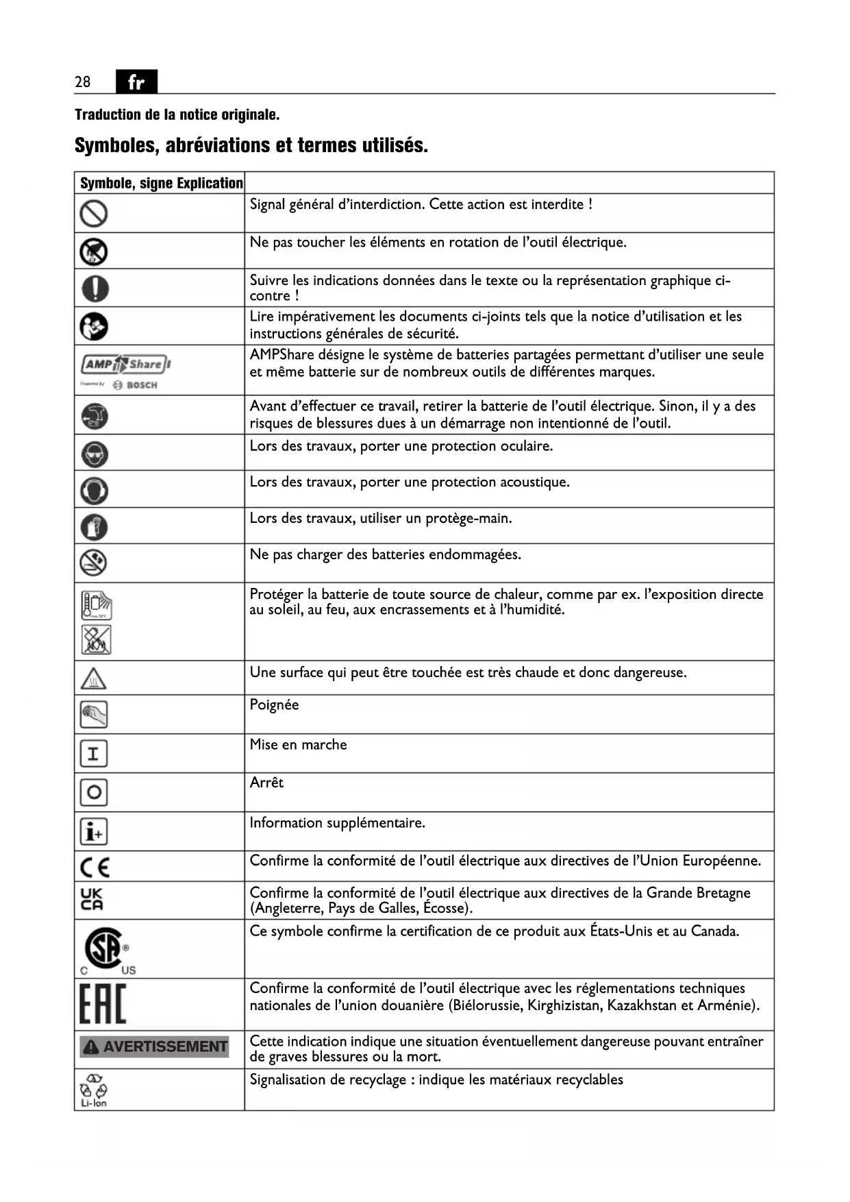 Traduction de la notice originale. Symboles, abréviations et termes utilisés. Symbole, signe Explication Signal général d’interdiction. Cette action est interdite ! Ne pas toucher les éléments en rotation de l’outil électrique. Suivre les indications données dans le texte ou la représentation graphique ci- contre ! Lire impérativement les documents ci-joints tels que la notice d’utilisation et les instructions générales de sécurité. AMPShare désigne le système de batteries partagées permettant d’utiliser une seule et même batterie sur de nombreux outils de différentes marques. Avant d’effectuer ce travail, retirer la batterie de l’outil électrique. Sinon, il y a des risques de blessures dues à un démarrage non intentionné de l’outil. Lors des travaux, porter une protection oculaire. Lors des travaux, porter une protection acoustique. Lors des travaux, utiliser un protège-main. Ne pas charger des batteries endommagées. Protéger la batterie de toute source de chaleur, comme par ex. l’exposition directe au soleil, au feu, aux encrassements et à l’humidité. Une surface qui peut être touchée est très chaude et donc dangereuse. Poignée Mise en marche Arrêt Information supplémentaire. Confirme la conformité de l’outil électrique aux directives de l’Union Européenne. Confirme la conformité de l’outil électrique aux directives de la Grande Bretagne (Angleterre, Pays de Galles, Écosse). Ce symbole confirme la certification de ce produit aux États-Unis et au Canada. Confirme la conformité de l’outil électrique avec les réglementations techniques nationales de l’union douanière (Biélorussie, Kirghizistan, Kazakhstan et Arménie). Cette indication indique une situation éventuellement dangereuse pouvant entraîner de graves blessures ou la mort. Signalisation de recyclage : indique les matériaux recyclables max.50°C AVERTISSEMENT29