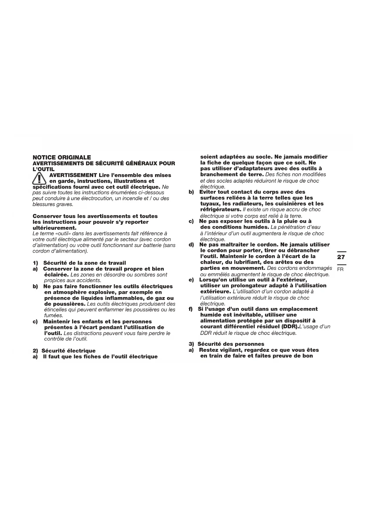 NOTICE ORIGINALE AVERTISSEMENTS DE SÉCURITÉ GÉNÉRAUX POUR L’OUTIL AVERTISSEMENT Lire l’ensemble des mises en garde, instructions, illustrations et spécifications fourni avec cet outil électrique. Ne pas suivre toutes les instructions énumérées ci-dessous peut conduire à une électrocution, un incendie et / ou des blessures graves. Conserver tous les avertissements et toutes les instructions pour pouvoir s’y reporter ultérieurement. Le terme «outil» dans les avertissements fait référence à votre outil électrique alimenté par le secteur (avec cordon d’alimentation) ou votre outil fonctionnant sur batterie (sans cordon d’alimentation).