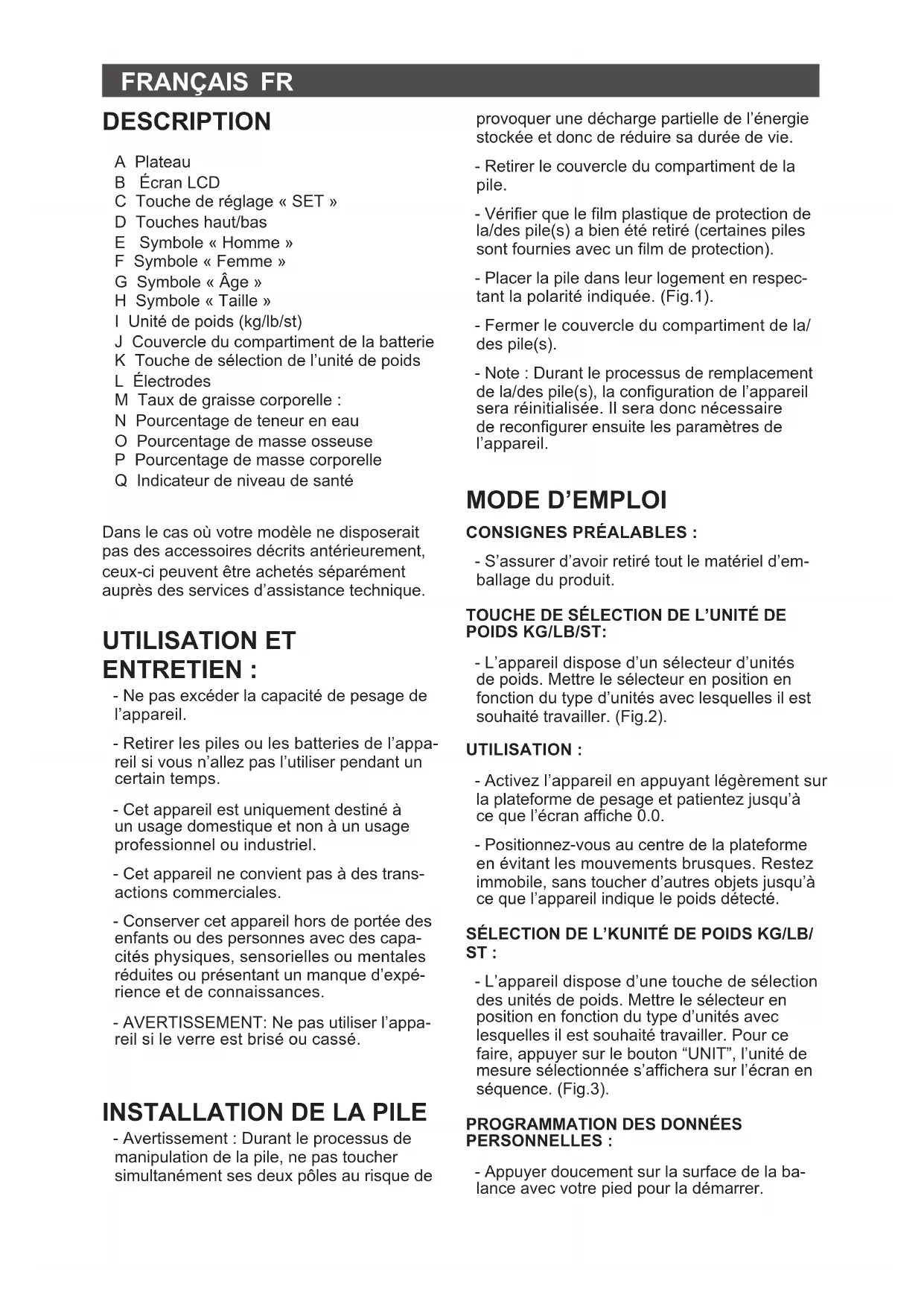 APPLIANCE: - Remove the battery from the appliance if you are not intending to use the appliance during an extended period. SPECIAL MESSAGES: - The following messages can appear on the screen: - Err: means that the appliance’s capacity has been exceeded or that there is an error in the body fat percentage measurement. - Lo: means that the battery has to be chan- ged. CLEANING - Clean the equipment with a damp cloth with a few drops of washing-up liquid and then dry. - Do not use solvents, or products with an acid or base pH such as bleach, or abrasive products, for cleaning the appliance. - Never submerge the appliance in water or any other liquid or place it under running water. SUPPLIES - Only the following type of supplies must be used with the appliance. (Fig.4). - Batterie type: 3V CR2032. - These supplies are available in specialist shops. SPECIFICATIONS: Measurement range Increment Max. Loading capacity 180 Kg (396 lb) % Body Fat 5-50% 0,1% % Body Water 15-90% 0,1% % Muscle Mass 5-60% 0,1% % Bones Mass 1-40% 0,1%FRANÇAIS FR DESCRIPTION A Plateau B Écran LCD C Touche de réglage « SET » D Touches haut/bas E Symbole « Homme » F Symbole « Femme » G Symbole « Âge » H Symbole « Taille » I Unité de poids (kg/lb/st) J Couvercle du compartiment de la batterie K Touche de sélection de l’unité de poids L Électrodes M Taux de graisse corporelle : N Pourcentage de teneur en eau O Pourcentage de masse osseuse P Pourcentage de masse corporelle Q Indicateur de niveau de santé Dans le cas où votre modèle ne disposerait pas des accessoires décrits antérieurement, ceux-ci peuvent être achetés séparément auprès des services d’assistance technique. UTILISATION ET ENTRETIEN : - Ne pas excéder la capacité de pesage de l’appareil. - Retirer les piles ou les batteries de l’appa- reil si vous n’allez pas l’utiliser pendant un certain temps. - Cet appareil est uniquement destiné à un usage domestique et non à un usage professionnel ou industriel. - Cet appareil ne convient pas à des trans- actions commerciales. - Conserver cet appareil hors de portée des enfants ou des personnes avec des capa- cités physiques, sensorielles ou mentales réduites ou présentant un manque d’expé- rience et de connaissances. - AVERTISSEMENT: Ne pas utiliser l’appa- reil si le verre est brisé ou cassé.