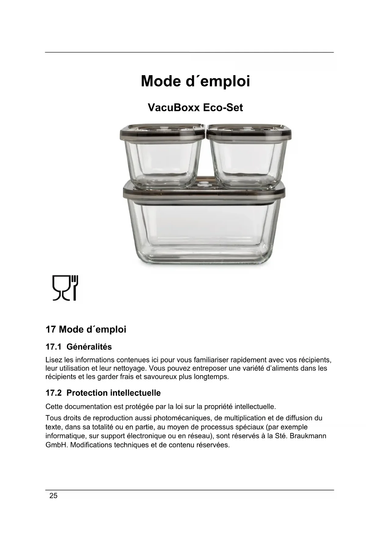 Cette documentation est protégée par la loi sur la propriété intellectuelle. Tous droits de reproduction aussi photomécaniques, de multiplication et de diffusion du texte, dans sa totalité ou en partie, au moyen de processus spéciaux (par exemple informatique, sur support électronique ou en réseau), sont réservés à la Sté. Braukmann GmbH. Modifications techniques et de contenu réservées. Mode d´emploi VacuBoxx Eco-Set26 18 Sécurité