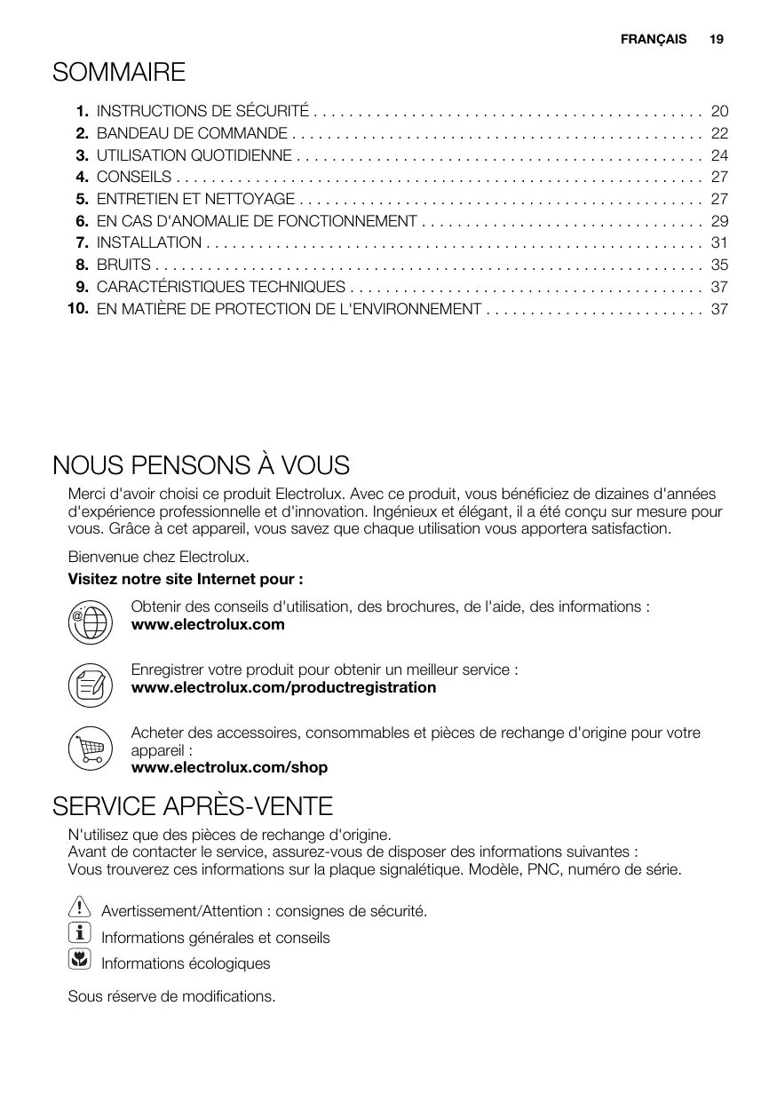 Merci d'avoir choisi ce produit Electrolux. Avec ce produit, vous bénéficiaz de dizaines d'années d'expérience professionnelle et d'innovation. Ingénieux et élégant, il a été concu sur mesure pour vous. Grâce à cet apparéil, vous savez que chaque utilisation vous apportera satisfaction.