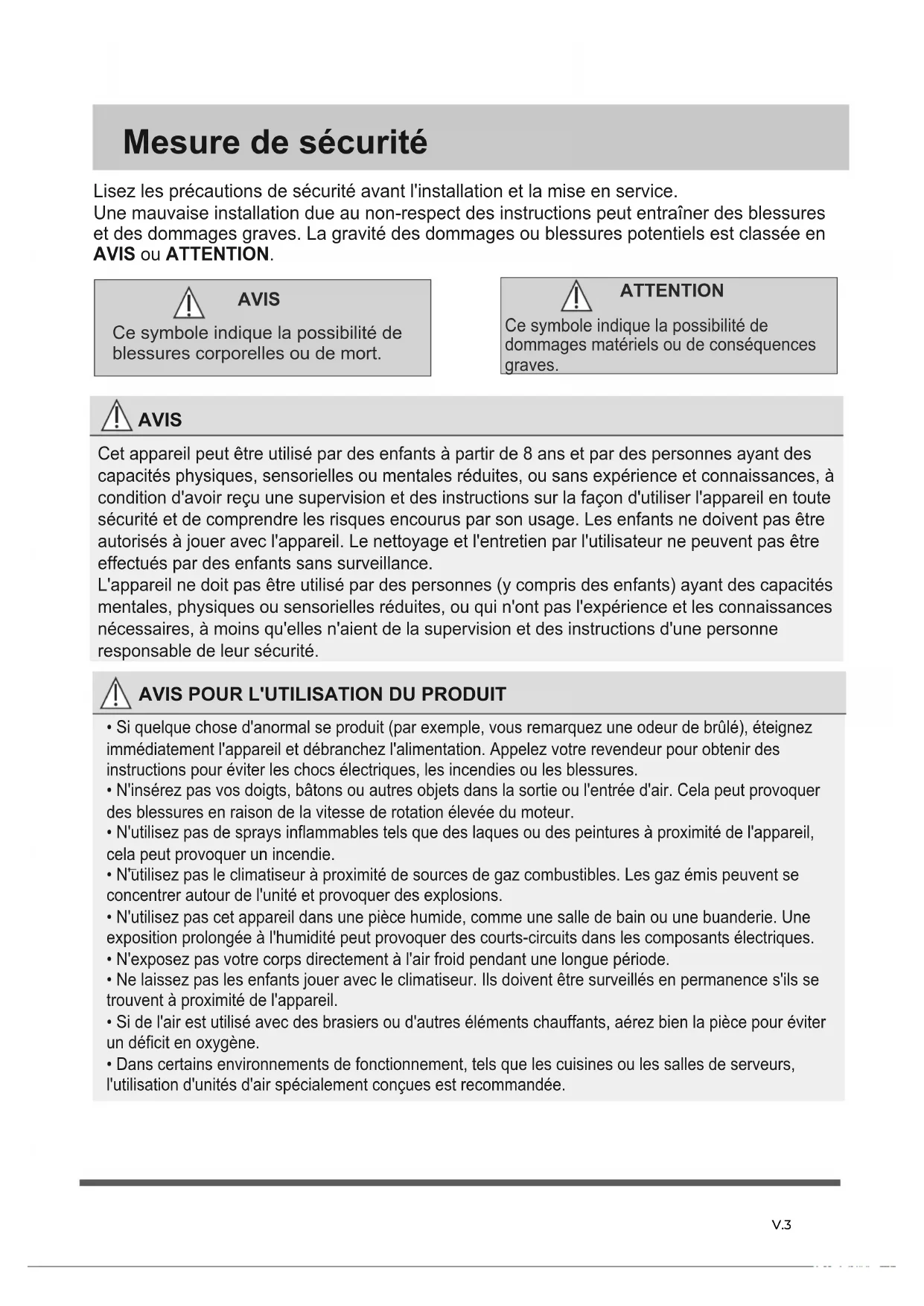 Conditions de la garantie commerciale...........................................37 V.3Lisez les précautions de sécurité avant l'installation et la mise en service. Une mauvaise installation due au non-respect des instructions peut entraîner des blessures et des dommages graves. La gravité des dommages ou blessures potentiels est classée en AVIS ou ATTENTION. AVIS Cet appareil peut être utilisé par des enfants à partir de 8 ans et par des personnes ayant des capacités physiques, sensorielles ou mentales réduites, ou sans expérience et connaissances, à condition d'avoir reçu une supervision et des instructions sur la façon d'utiliser l'appareil en toute sécurité et de comprendre les risques encourus par son usage. Les enfants ne doivent pas être autorisés à jouer avec l'appareil. Le nettoyage et l'entretien par l'utilisateur ne peuvent pas être effectués par des enfants sans surveillance. L'appareil ne doit pas être utilisé par des personnes (y compris des enfants) ayant des capacités mentales, physiques ou sensorielles réduites, ou qui n'ont pas l'expérience et les connaissances nécessaires, à moins qu'elles n'aient de la supervision et des instructions d'une personne responsable de leur sécurité.