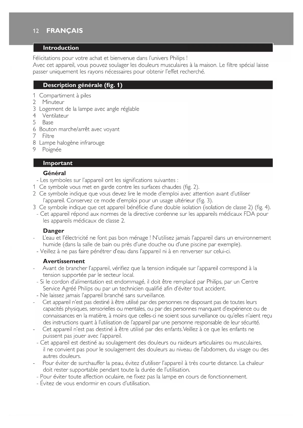 Réglez l’orientation des rayons infrarouges en inclinant la lampe vers l’avant ou vers l’arrière (g. 10). 4 Asseyez-vous ou allongez-vous à une distance correcte de l’appareil. - À une distance de 30-40 cm du corps, l’appareil chauffe une zone d’environ 40 cm sur 30 cm (l x H). À une distance plus élevée, la zone chauffée est plus large, mais l’intensité des rayons infrarouges et de la chaleur diminue. À une distance moindre, la zone chauffée est plus petite, mais l’intensité des rayons infrarouges et de la chaleur augmente. - Assurez-vous que la distance séparant votre corps de l’appareil est sufsamment grande pour éviter tout contact accidentel avec le ltre, qui devient très chaud. - Placez l’appareil à une distance à laquelle la sensation de chaleur reste confortable. FRANÇAIS14Remarque : La chaleur dégagée par la lampe atteint son intensité maximale quelques minutes après la mise en marche. L’appareil produit néanmoins ses effets dès les premières minutes de fonctionnement. Durée d’utilisation La durée d’utilisation varie en fonction de la personne et du type d’application. Il est recommandé d’effectuer plusieurs courtes séances par jour (2 séances de 15 minutes par ex.), pendant plusieurs jours, pour obtenir des résultats. En cas de doute, consultez toujours votre médecin. Utilisation du système à chaleur infrarouge 1 Insérez la che dans la prise secteur. 2 Mettez l’appareil en marche en appuyant sur le bouton marche/arrêt. Le voyant d’alimentation vert s’allume (g. 11). 3 Dénissez la durée d’utilisation souhaitée (0-99 minutes) en appuyant sur le bouton du minuteur. Maintenez le bouton enfoncé pour effectuer le réglage plus rapidement. La durée dénie apparaît sur l’afcheur. , Deux secondes après avoir relâché le bouton du minuteur, ce dernier commence un compte à rebours en minutes. La dernière minute s’afche en secondes. Lors du compte à rebours, la durée restante clignote sur l’afcheur. , À la n de la durée dénie, un signal sonore est émis et 00 clignote sur l’afcheur. - Appuyez sur le bouton du minuteur pour arrêter le signal sonore. - Si vous n’appuyez pas sur le bouton du minuteur, le signal sonore s’arrête automatiquement au bout de 45 secondes. , Pour modier la durée dénie en cours d’utilisation, maintenez enfoncé le bouton du minuteur pendant deux secondes jusqu’à ce que 00 apparaisse sur l’afcheur. Ensuite, utilisez le bouton du minuteur pour dénir une nouvelle durée d’utilisation. Remarque : Le minuteur n’éteint pas l’appareil. Il indique uniquement la n de la durée dénie. Nettoyage Débranchez l’appareil et laissez-le refroidir pendant environ 15 minutes avant de le nettoyer. N’utilisez jamais de produits abrasifs tels que détergents à récurer, essence ou acétone pour nettoyer l’appareil. 1 Nettoyez le logement de la lampe et le socle à l’aide d’un chiffon humide. Veillez à ne pas faire pénétrer d’eau dans l’appareil. 2 Nettoyez l’extérieur du ltre à l’aide d’un chiffon doux humecté d’alcool dénaturé. Rangement Évitez tout contact entre le cordon d’alimentation et le ltre lorsqu’il est chaud. 1 Débranchez l’appareil et laissez-le refroidir pendant environ 15 minutes avant de le ranger. - Tenez toujours l’appareil par sa poignée pour le soulever ou le transporter (g. 12). 2 Rangez l’appareil dans un endroit sec. FRANÇAIS 15Remplacement Filtre Le ltre vous protège contre les rayons nocifs. Si le ltre est endommagé ou cassé, cessez d’utiliser l’appareil. Pour plus d’informations, contactez le Service Consommateurs Philips. Remarque : Si le ltre est cassé ou endommagé au cours de la période de garantie, contactez le Service Consommateurs pour remplacer l’appareil. Lampe L’efcacité de la lampe ne diminue pas au l du temps. Si la lampe ne fonctionne plus, n’essayez pas de la remplacer. Pour plus d’informations, contactez le Service Consommateurs Philips. Remarque : Si la lampe ne fonctionne plus au cours de la période de garantie, n’essayez pas de la remplacer, mais contactez le Service Consommateurs pour remplacer l’appareil. Batterie Le compartiment à piles du minuteur se trouve dans le renfoncement à l’arrière de l’appareil. 1 Retirez le cache du compartiment à pile en la faisant tourner vers la gauche à l’aide d’un tournevis. 2 Insérez une nouvelle pile en veillant à respecter la polarité de la nouvelle pile. Remarque : Nous vous recommandons d’utiliser une pile bouton alcaline de 1,5 V, de type LR54. 3 Pour fermer le compartiment à pile, replacez le cache et faites le tourner vers la droite à l’aide d’un tournevis. Recyclage Lorsqu’il ne fonctionnera plus, ne jetez pas l’appareil avec les ordures ménagères, mais déposez-le à un endroit assigné à cet effet, où il pourra être recyclé. Vous contribuerez ainsi à la protection de l’environnement. Garantie et assistance Si vous avez besoin d’une assistance ou d’informations supplémentaires, consultez le site Web www.philips.com/support ou lisez le dépliant séparé sur la garantie internationale. Dépannage Si l’appareil ne fonctionne pas (correctement), consultez d’abord la liste ci-dessous. Si le problème rencontré ne gure pas dans la liste, l’appareil est probablement défectueux. Dans ce cas, contactez le Service Consommateurs Philips. Problème Cause Solution Impossible de mettre l’appareil en marche. La che n’a pas été correctement insérée dans la prise secteur. Insérez correctement la che dans la prise secteur. Il y a peut être une panne de courant. Vériez si l’alimentation électrique fonctionne en branchant un autre appareil. La lampe est peut-être défectueuse. Contactez le Service Consommateurs Philips. FRANÇAIS16Problème Cause Solution Le cordon d’alimentation de l’appareil est peut-être endommagé. Vériez le cordon d’alimentation. S’il e