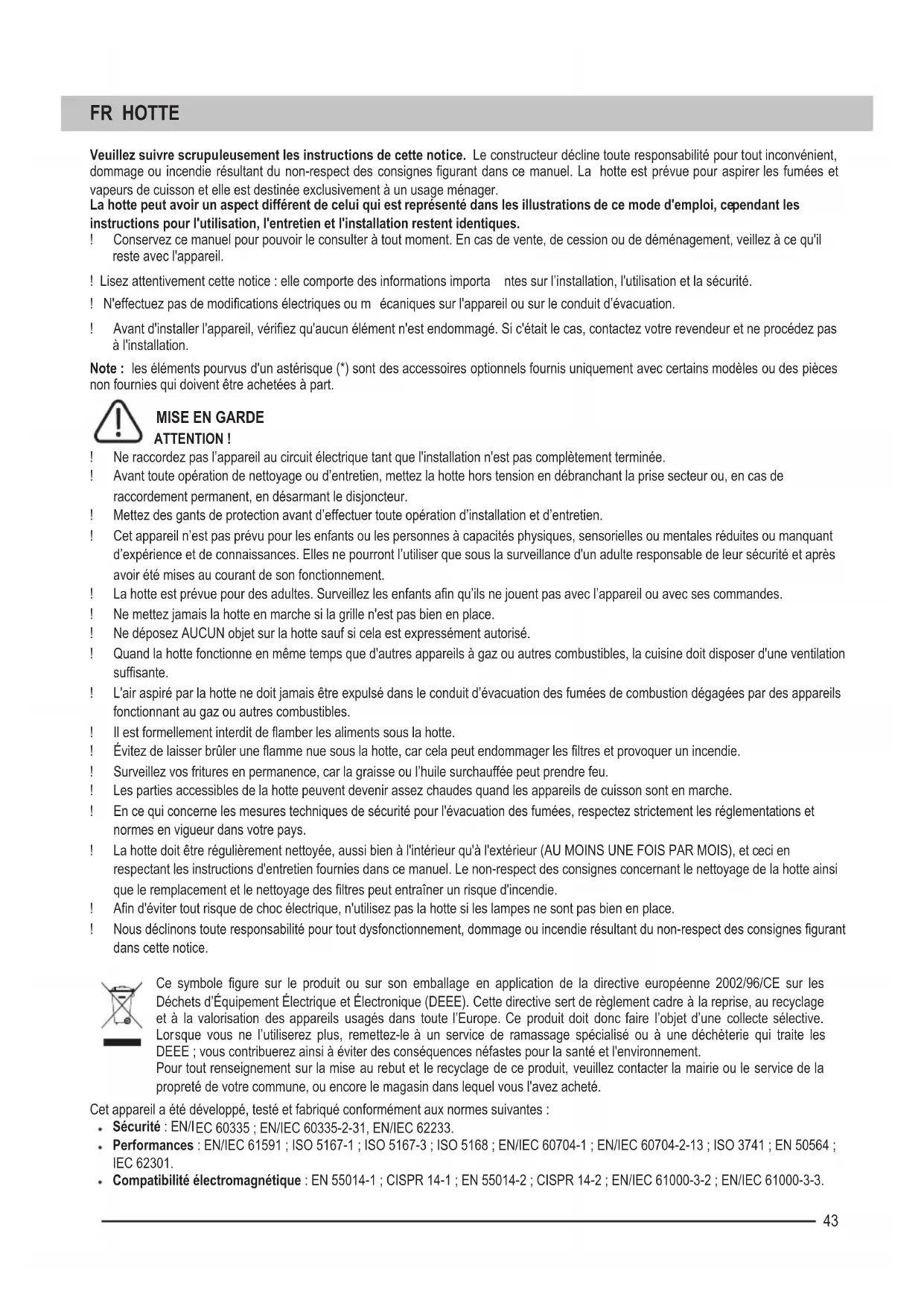 ATTENTION ! ! Ne raccordez pas l’appareil au circuit électrique tant que l'installation n'est pas complètement terminée. ! Avant toute opération de nettoyage ou d’entretien, mettez la hotte hors tension en débranchant la prise secteur ou, en cas de raccordement permanent, en désarmant le disjoncteur. ! Mettez des gants de protection avant d’effectuer toute opération d’installation et d’entretien. ! Cet appareil n’est pas prévu pour les enfants ou les personnes à capacités physiques, sensorielles ou mentales réduites ou manquant d’expérience et de connaissances. Elles ne pourront l’utiliser que sous la surveillance d'un adulte responsable de leur sécurité et après avoir été mises au courant de son fonctionnement. ! La hotte est prévue pour des adultes. Surveillez les enfants afin qu’ils ne jouent pas avec l’appareil ou avec ses commandes. ! Ne mettez jamais la hotte en marche si la grille n'est pas bien en place. ! Ne déposez AUCUN objet sur la hotte sauf si cela est expressément autorisé. ! Quand la hotte fonctionne en même temps que d'autres appareils à gaz ou autres combustibles, la cuisine doit disposer d'une ventilation suffisante. ! L'air aspiré par la hotte ne doit jamais être expulsé dans le conduit d’évacuation des fumées de combustion dégagées par des appareils fonctionnant au gaz ou autres combustibles. ! Il est formellement interdit de flamber les aliments sous la hotte. ! Évitez de laisser brûler une flamme nue sous la hotte, car cela peut endommager les filtres et provoquer un incendie. ! Surveillez vos fritures en permanence, car la graisse ou l’huile surchauffée peut prendre feu. ! Les parties accessibles de la hotte peuvent devenir assez chaudes quand les appareils de cuisson sont en marche. ! En ce qui concerne les mesures techniques de sécurité pour l'évacuation des fumées, respectez strictement les réglementations et normes en vigueur dans votre pays. ! La hotte doit être régulièrement nettoyée, aussi bien à l'intérieur qu'à l'exté rieur (AU MOINS UNE FOIS PAR MOIS), et ceci en respectant les instructions d'entretien fournies dans ce manuel. Le non-respect des consignes concernant le nettoyage de la hotte ainsi que le remplacement et le nettoyage des filtres peut entraîner un risque d'incendie. ! Afin d'éviter tout risque de choc électrique, n'utilisez pas la hotte si les lampes ne sont pas bien en place. ! Nous déclinons toute responsabilité pour tout dysfonctionnement, dommage ou incendie résultant du non-respect des consignes figurant dans cette notice. Ce symbole figure sur le produit ou sur son emballage en application de la directive européenne 2002/96/CE sur les Déchets d’Équipement Électrique et Électronique (DEEE). Cette directive sert de règlement cadre à la reprise, au recyclage et à la valorisation des appareils usagés dans toute l’Europe. Ce produit doit donc faire l’objet d’une collecte sélective. Lor sque vous ne l’utiliserez plus, remettez-le à un service de ramassage spécialisé ou à une déchèterie qui traite les DEEE ; vous contribuerez ainsi à éviter des conséquences néfastes pour la santé et l'environnement. Pour tout renseignement sur la mise au rebut et le recyclage de ce produit, veuillez contacter la mairie ou le service de la propreté de votre commune, ou encore le magasin dans lequel vous l'avez acheté. Cet appareil a été développé, testé et fabriqué conformément aux normes suivantes : Sécurité : EN/I EC 60335 ; EN/IEC 60335-2-31, EN/IEC 62233. Performances : EN/IEC 61591 ; ISO 5167-1 ; ISO 5167-3 ; ISO 5168 ; EN/IEC 60704-1 ; EN/IEC 60704-2-13 ; ISO 3741 ; EN 50564 ; IEC 62301. Compatibilité électromagnétique : EN 55014-1 ; CISPR 14-1 ; EN 55014-2 ; CISPR 14-2 ; EN/IEC 61000-3-2 ; EN/IEC 61000-3-3.44 Suggestions pour une utilisation correcte afin de réduire l'impact sur l'environnement : mettez la hotte en MARCHE à la vitesse minimale lorsque vous commencez à cuisiner et laissez-la fonctionner quelques minutes après la fin de la cuisson. Augmentez la vitesse uniquement en cas de fumée et de vapeur importantes et n'utilisez la fonction booster que dans des situations extrêmes. Remplacez le ou les filtre(s) à charbon quand cela est néces saire pour que les odeurs soient éliminées. Nettoyez le(s) filtre(s) à graisse quand cela est nécessaire pour maintenir son/leur efficacité. Concernant la gaine d'évacuation, choisissez le diamètre maximum indiqué dans ce manuel pour optimiser l'efficacité et minimiser le bruit. Consignes supplémentaires pour l'installation Pour l'installation, utilisez uniquement les vis de fixation fournies avec le produit ou , à défaut, achetez des vis appropriées. Elles doivent avoir la longueur indiquée dans le Guide d'installation. En cas de doute, consultez le service après-vente agréé ou une personne qualifiée. ATTENTION ! Si les vis ou le dispositif de fixation ne sont pas installés conformément à ces instructions, cela peut entraîner des risques électriques. UTILISATION La hotte peut fonctionner en mode évacuation ou en mode recyclage. Version évacuation Dans ce cas, les vapeurs de cuisson sont expulsées vers l'extérieur à travers un tuyau d'évacuation qui est fixé à un raccord cylindrique monté sur la partie supérieure de la hotte. Attention ! Le tuyau d’évacuation n’est pas fourni et doit être acheté à part. Son diamètre doit être égal à celui du raccord cylindrique. Sur son parcours horizontal, le tuyau doit être légèrement incliné vers le haut (10° e nviron) de façon à expulser l’air plus facilement vers l’extérieur. Attention ! Si la hotte est équipée d'un filtre à charbon, il faudra le retirer. Le tuyau d’évacuation raccordé à la hotte et les trous percés dans les murs pour le passage du tuyau doivent avoir le même diamètre que la sortie d'air. S'ils ont un diamètre inférieur, cela entraînera une diminution des perfo