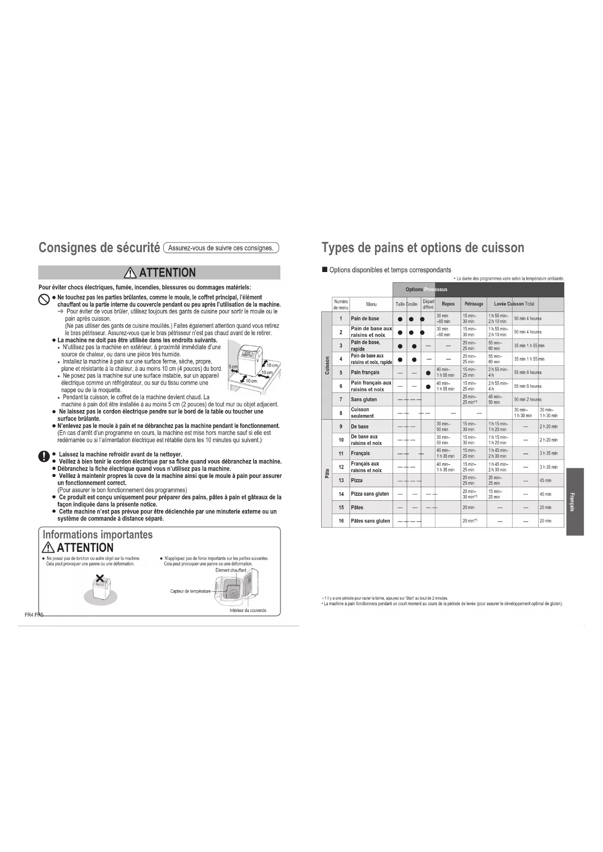 La durée des programmes varie selon la température ambiante.Options ProcessusNuméro de menu Menu Taille CroûteDépart différéReposPétrissageLevée Cuisson TotalCuisson Pain de basel l l30 min –60 min15 min– 30 min1 h 55 min– 2 h 10 min50 min 4 heures Pain de base aux raisins et noixl l l30 min –60 min15 min– 30 min1 h 55 min– 2 h 10 min50 min 4 heures Pain de base, rapide l l