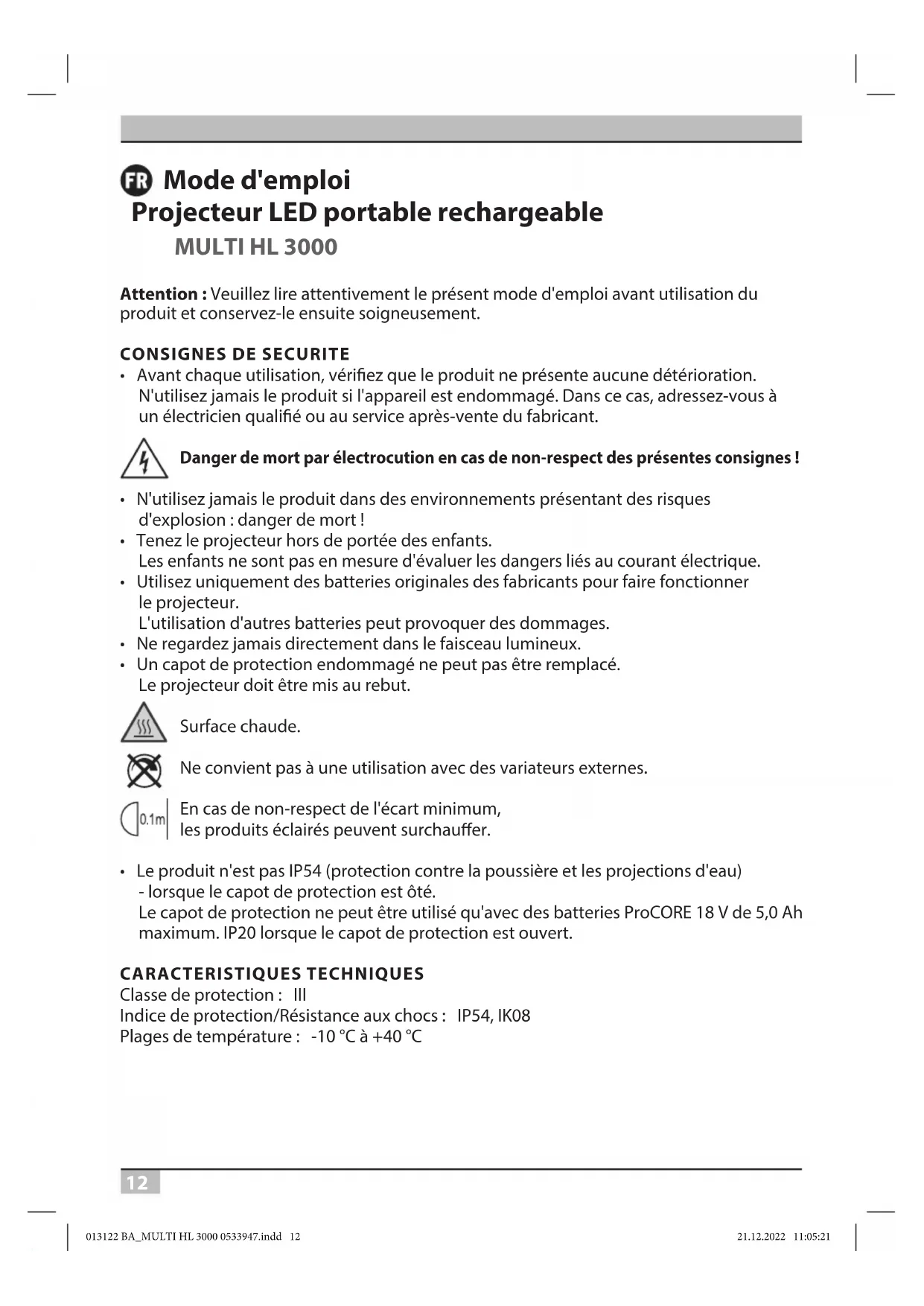 - Le produit n'est pas IP54 (protection contre la poussière et les projections d'eau) - lorsque le capot de protection est ôté. Le capot de protection ne peut être utilisé qu'avec des batteries ProCORE 18 V de 5,0 Ah maximum. IP20 lorsque le capot de protection est ouvert. CARACTERISTIQUES TECHNIQUES Classe de protection : III Indice de protection/Résistance aux chocs : IP54, IK08 Plages de température : -10 °C à +40 °C 013122 BA_MULTI HL 3000 0533947.indd 12013122 BA_MULTI HL 3000 0533947.indd 12 21.12.2022 11:05:2121.12.2022 11:05:2113 MULTI HL 3000 Mode d'emploi Type : MULTI HL 3000 Types de batterie compatibles : Vous trouverez un aperçu de tous les adaptateurs disponibles et des batteries correspondantes sur notre site Internet www.brennenstuhl.com Surface de projection maximale : 183,63 cm