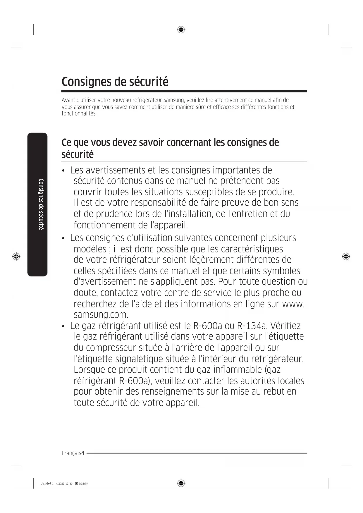Consignes de sécurité 85 Instructions d'installation 85 Consignes relatives à la température 86 Informations du modèle et commande de pièces de rechange 89 Untitled-1 2 2022-12-13 3:32:58Français 3 Sommaire Open Source Announcement 90 Untitled-1 3 2022-12-13 3:32:58Français4 Consignes de sécurité Avant d'utiliser votre nouveau réfrigérateur Samsung, veuillez lire attentivement ce manuel an de vous assurer que vous savez comment utiliser de manière sûre et efcace ses différentes fonctions et fonctionnalités. Ce que vous devez savoir concernant les consignes de sécurité