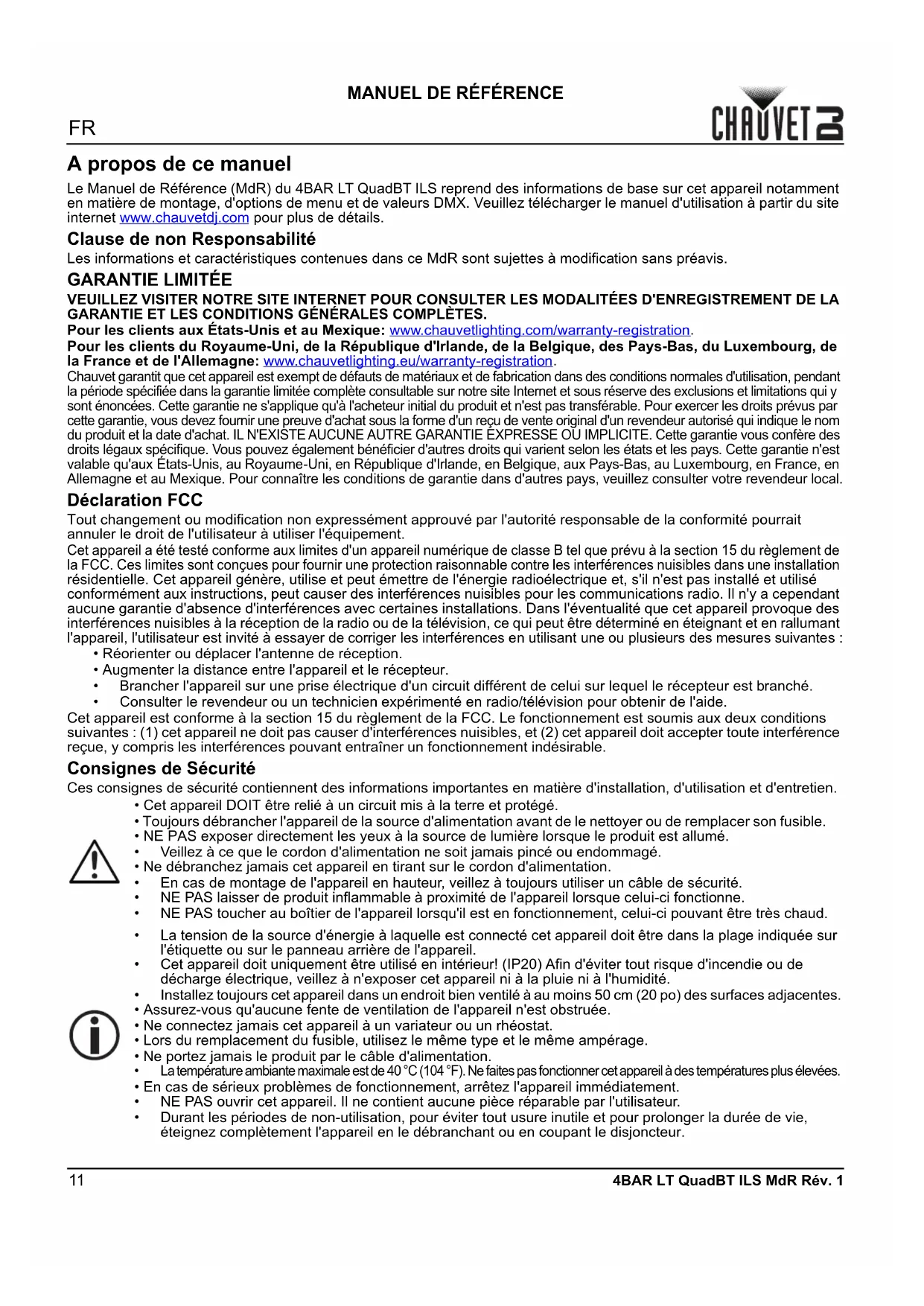 4BAR LT QuadBT ILS MdR Rév. 1 A propos de ce manuel Le Manuel de Référence (MdR) du 4BAR LT QuadBT ILS reprend des informations de base sur cet appareil notamment en matière de montage, d'options de menu et de valeurs DMX. Veuillez télécharger le manuel d'utilisation à partir du site internet www.chauvetdj.com pour plus de détails. Clause de non Responsabilité Les informations et caractéristiques contenues dans ce MdR sont sujettes à modification sans préavis.