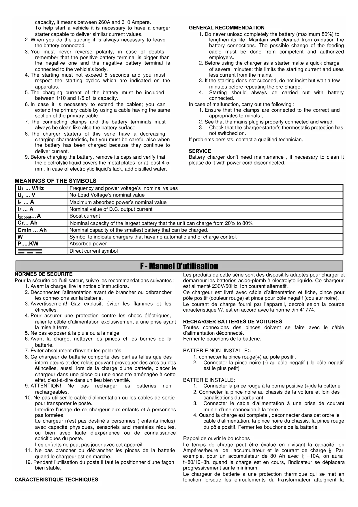 Les produits de cette série sont des dispositifs adaptés pour charger et demarreur les batteries acide-plomb à électrolyte liquide. Ce chargeur est alimenté 230V/50Hz 1ph courant alternatif.