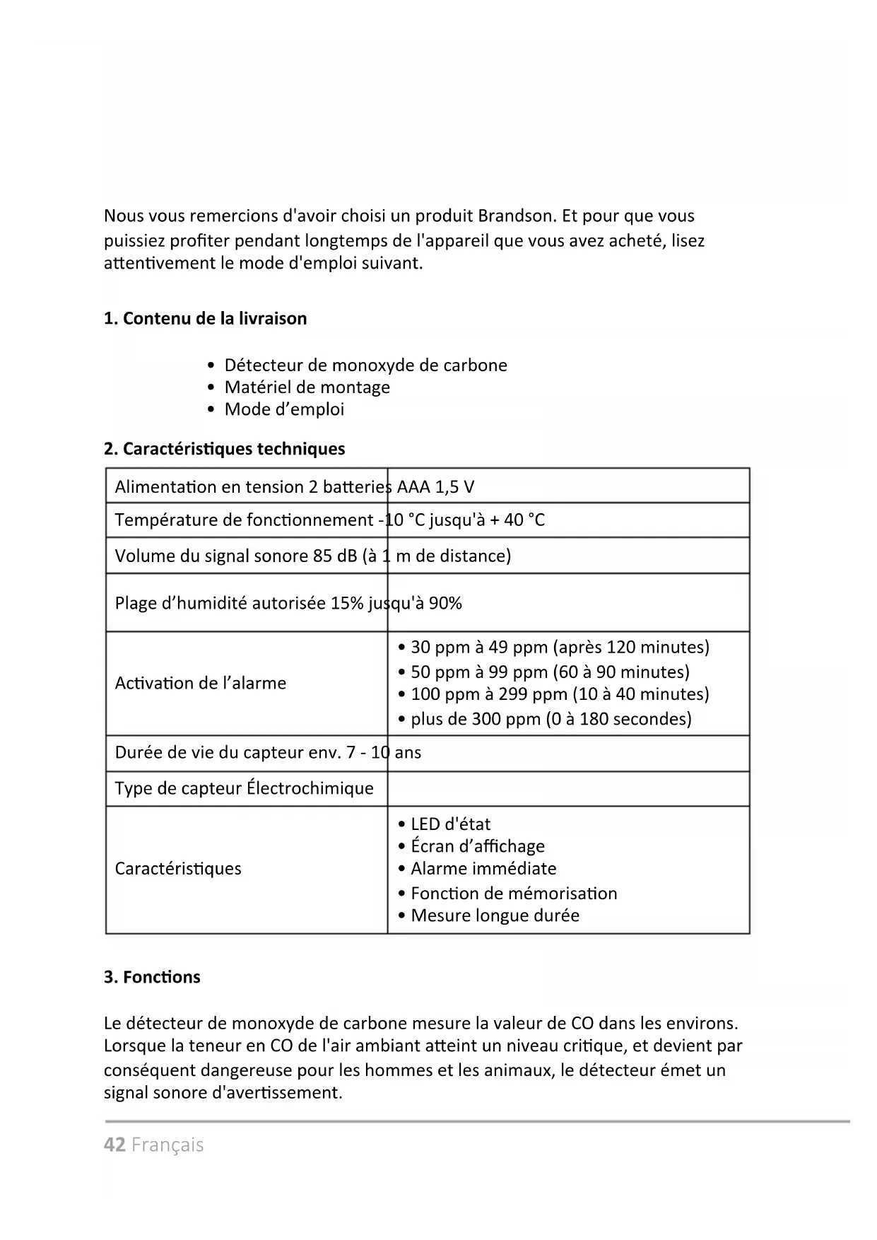 Veuillez noter que le détecteur de monoxyde de carbone ne sert pas de remplacement pour un détecteur de fumée ou de gaz.