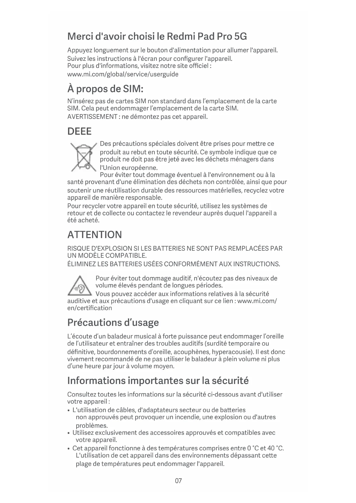 Nano-SIM Nano-SIM Nano-SIM Micro SD 06Merci d'avoir choisi le Redmi Pad Pro 5G Appuyez longuement sur le bouton d'alimentation pour allumer l'appareil. Suivez les instructions à l'écran pour configurer l'appareil. Pour plus d'informations, visitez notre site officiel : www.mi.com/global/service/userguide À propos de SIM: N’insérez pas de cartes SIM non standard dans l’emplacement de la carte SIM. Cela peut endommager l’emplacement de la carte SIM.