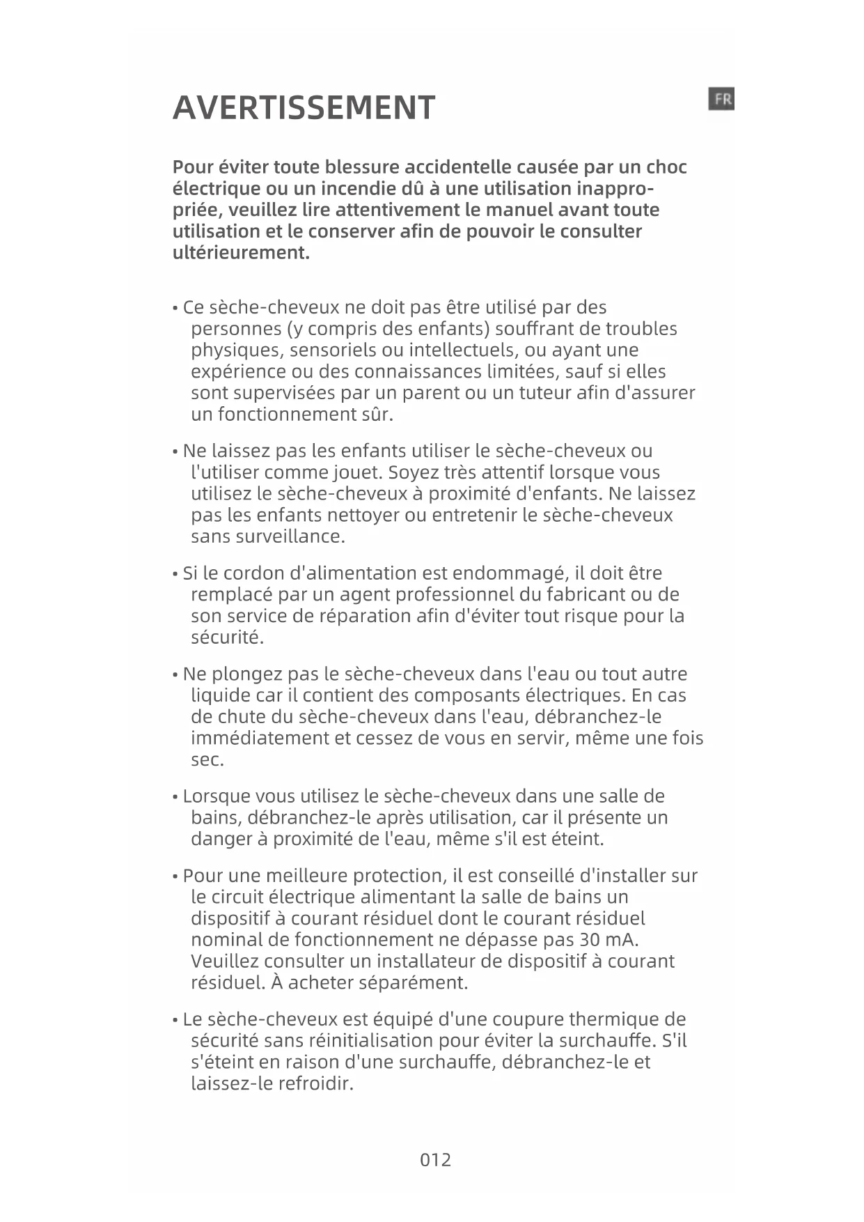 - Le sèche-cheveux est équipé d'une coupure thermique de sécurité sans réinitialisation pour éviter la surchauffe. S'il s'éteint en raison d'une surchauffe, débranchez-le et laissez-le refroidir. 012• N'utilisez pas le sèche-cheveux à proximité d'une baignoire, d'une douche, d'un évier ou de toute autre source d'eau.