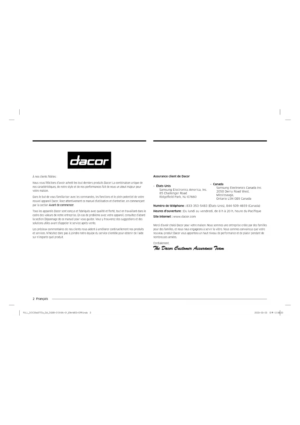 L'assistance technique sera assurée par un prestataire désigné par Dacor pendant les heures de travail normales. Veuillez noter que les prestataires de service sont des entités indépendantes et ne sont pas des agents de Dacor. Les produits de maison témoin ou d'exposition ayant une date de production antérieure de plus de 5 ans, les produits vendus sans garantie et les produits installés pour un usage non résidentiel, incluant, sans s'y limiter, les organisations religieuses, les casernes de pompiers, les bed and breakfast et les spas disposent d'une garantie de pièces d'un an. Tout frais de livraison, installation et main d'œuvre et autre frais de service sont de la responsabilité de l'acheteur. La garantie sera nulle et non avenue sur les produits altérés, déformés ou sans numéros et étiquettes de série. Le propriétaire doit fournir une preuve d'achat ou le relevé de clôture pour les nouvelles constructions sur demande. Tous les produits Dacor doivent être accessibles à l'assistance technique. La garantie est nulle et non avenue si des produits non approuvés ETL et CUL sont transportés depuis les États-Unis. HORS DES CINQUANTE ÉTATS DES ÉTATS-UNIS, DU DISTRICT DE COLUMBIA ET DU CANADA : GARANTIE LIMITÉE LA PREMIÈRE ANNÉE Si votre produit Dacor dysfonctionne dans l'année qui suit la date initiale de l'achat, en raison d'un défaut de matériel ou d'une malfaçon, Dacor fournira une nouvelle pièce, franco à bord, pour remplacer la pièce défectueuse. Tout frais de livraison, installation et main d'œuvre et autre frais de service sont de la responsabilité de l'acheteur. FULL_DOC30x977Dx_DA_DG68-01316A-01_EN+MES+CFR.indb 82FULL_DOC30x977Dx_DA_DG68-01316A-01_EN+MES+CFR.indb 82 2023-03-03 오후 12:06:472023-03-03 오후 12:06:47Français 83 Annexe Éléments non couverts par la garantie Merci de nous contacter en cas de problème survenant au-delà de la période de garantie standard. Dacor examine chaque problème et chaque question de ses clients pour leur fournir la meilleure solution possible selon les situations. LES SOLUTIONS INDIQUÉES DANS LES GARANTIES EXPRESSES CI-DESSUS SONT LES SEULES SOLUTIONS. AINSI, AUCUNE AUTRE GARANTIE EXPRESSE N'EST FAITE, ET, EN DEHORS DES CINQUANTE ÉTATS DES ÉTATS-UNIS, DU DISTRICT DE COLUMBIA ET DU CANADA, TOUTES LES GARANTIES IMPLICITES, Y COMPRIS, SANS S'Y LIMITER, TOUTE GARANTIE IMPLICITE DE QUALITÉ MARCHANDE OU D'ADAPTATION À UN USAGE OU UNE FIN PARTICULIERS, SE LIMITENT À UNE PÉRIODE D'UN AN À COMPTER DE LA DATE INITIALE D'ACHAT. DACOR NE SERA EN AUCUN CAS TENU RESPONSABLE DE TOUT DOMMAGE ET FRAIS IMMATÉRIEL ET ACCESSOIRE. SI DACOR REMPORTE TOUTE POURSUITE JUDICIAIRE, TOUS LES FRAIS, Y COMPRIS LES FRAIS D'AVOCAT, SERONT REMBOURSÉS À DACOR PAR LE CLIENT DE DACOR. AUCUNE GARANTIE EXPRESSE OU IMPLICITE N'EST FAITE À AUCUN ACHETEUR CONCERNANT LA REVENTE. Certains États et certaines juridictions n'autorisent pas de limitations quant à la durée des garanties implicites ni l'exclusion ou la limitation de dommages accessoires ou indirects ; il se peut par conséquent que les limitations et exclusions énoncées ci-dessus ne s'appliquent pas à votre cas. Cette garantie vous confère des droits légaux spéciques, vous pouvez également avoir d'autres droits qui varient d'un État à l'autre. Annexe Annonce de contenu libre Le present produit contient un logiciel libre. Vous pouvez obtenir l’intégralité du code source correspondant durant une période de trois ans après la dernière livraison de ce produit en contactant notre équipe d'assistance via http://opensource.samsung.com (Veuillez utiliser le menu « Inquiry ».) Il est également possible d’obtenir l’intégralité du code source correspondant sur un support physique tel qu’un CD-ROM. Des frais minimum seront requis. L'URL suivante http://opensource.samsung.com/opensource/OVEN_A20_TZ/seq/0 donne accès aux informations de licence gratuites associées à cet appareil. Cette offre est valable pour toute personne accusant réception de ces informations. FULL_DOC30x977Dx_DA_DG68-01316A-01_EN+MES+CFR.indb 83FULL_DOC30x977Dx_DA_DG68-01316A-01_EN+MES+CFR.indb 83 2023-03-03 오후 12:06:482023-03-03 오후 12:06:48Dacor ∙ 14425 Clark Avenue, City of Industry, CA 91745 ∙ Téléphone : 833-353-5483 (États-Unis), 844-509-4659 (Canada) ∙ www.dacor.com DG68-01316A-01 FULL_DOC30x977Dx_DA_DG68-01316A-01_EN+MES+CFR.indb 84FULL_DOC30x977Dx_DA_DG68-01316A-01_EN+MES+CFR.indb 84 2023-03-03 오후 12:06:482023-03-03 오후 12:06:48
