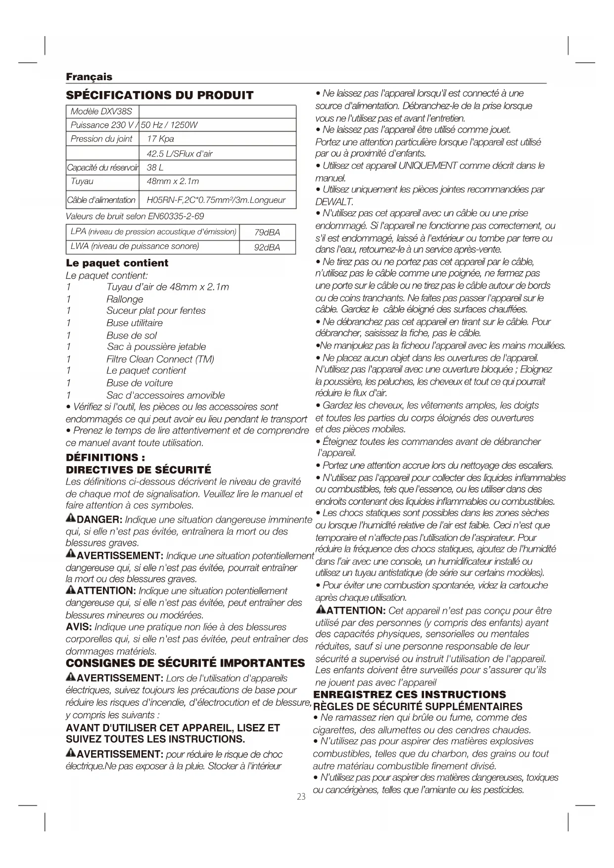 DXV38S - Aspirateur industriel DEWALT - Notice d'utilisation et mode d'emploi gratuit
