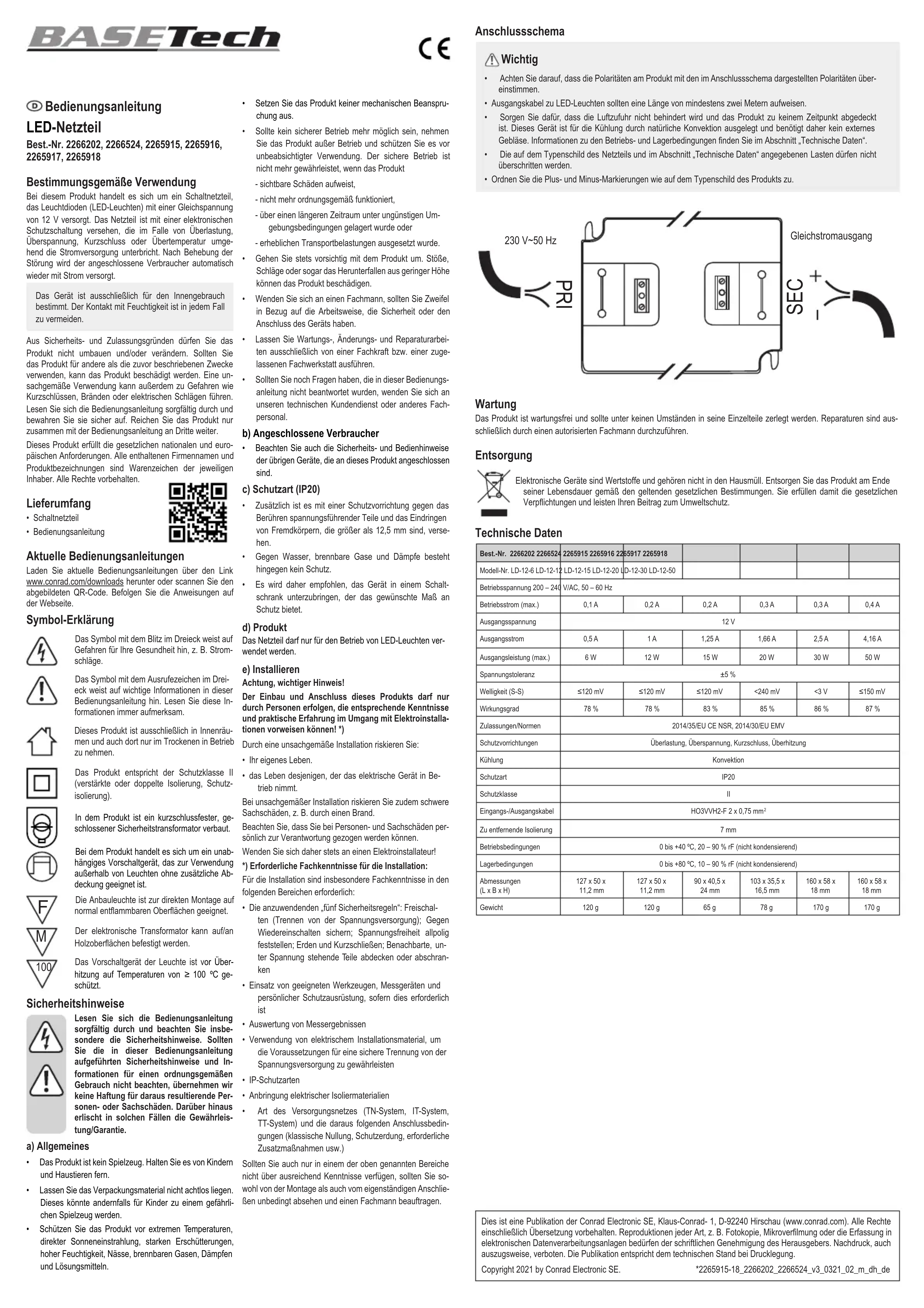 Le produit est une alimentation à découpage avec une tension de sortie constante de 12 V/CC pour une utilisation avec des lampes à diodes électroluminescentes (LED). Un circuit de protection électronique coupe l'alimentation électrique en cas de surcharge, de surtension, de court-circuit et de surchauffe. L'alimentation électrique sera automatiquement rétablie après l'élimination de la panne.
