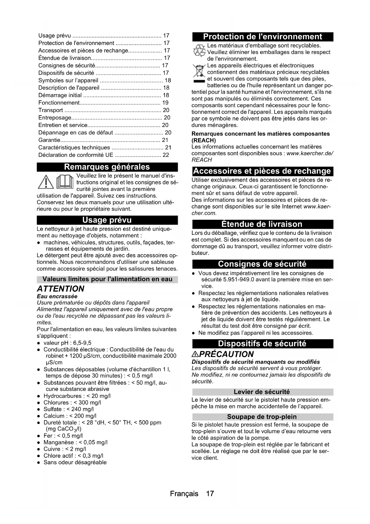 - /l) ● Fer : < 0,5 mg/l ● Manganèse : < 0,05 mg/l ● Cuivre : < 2 mg/l ● Chlore actif : < 0,3 mg/l ● Sans odeur désagréable Protection de l'environnement Les matériaux d'emballage sont recyclables. Veuillez éliminer les emballages dans le respect de l'environnement. Les appareils électriques et électroniques contiennent des matériaux précieux recyclables et souvent des composants tels que des piles, batteries ou de l'huile représentant un danger po- tentiel pour la santé humaine et l'environnement, s'ils ne sont pas manipulés ou éliminés correctement. Ces composants sont cependant nécessaires pour le fonc- tionnement correct de l'appareil. Les appareils marqués par ce symbole ne doivent pas être jetés dans les or- dures ménagères. Remarques concernant les matières composantes (REACH) Les informations actuelles concernant les matières composantes sont disponibles sous : www.kaercher.de/ REACH Accessoires et pièces de rechange Utiliser exclusivement des accessoires et pièces de re- change originaux. Ceux-ci garantissent le fonctionne- ment sûr et sans défaut de votre appareil. Des informations sur les accessoires et pièces de re- change sont disponibles sur le site Internet www.kaer- cher.com. Étendue de livraison Lors du déballage, vérifiez que le contenu de la livraison est complet. Si des accessoires manquent ou en cas de dommage dû au transport, veuillez informer votre distri- buteur. Consignes de sécurité ● Vous devez impérativement lire les consignes de sécurité 5.951-949.0 avant la première mise en ser- vice. ● Respectez les réglementations nationales relatives aux nettoyeurs à jet de liquide. ● Respectez les réglementations nationales en ma- tière de prévention des accidents. Les nettoyeurs à jet de liquide doivent être testés régulièrement. Le résultat du test doit être consigné par écrit. ● Ne modifiez pas l’appareil ni les accessoires. Dispositifs de sécurité 몇 PRÉCAUTION Dispositifs de sécurité manquants ou modifiés Les dispositifs de sécurité servent à vous protéger. Ne modifiez, ni ne contournez jamais les dispositifs de sécurité. Levier de sécurité Le levier de sécurité sur le pistolet haute pression em- pêche la mise en marche accidentelle de l’appareil. Soupape de trop-plein Si le pistolet haute pression est fermé, la soupape de trop-plein s’ouvre et tout le volume d’eau retourne vers le côté aspiration de la pompe. La soupape de trop-plein est réglée par le fabricant et scellée. Le réglage ne doit être réalisé que par le ser- vice client. Usage prévu p. 17