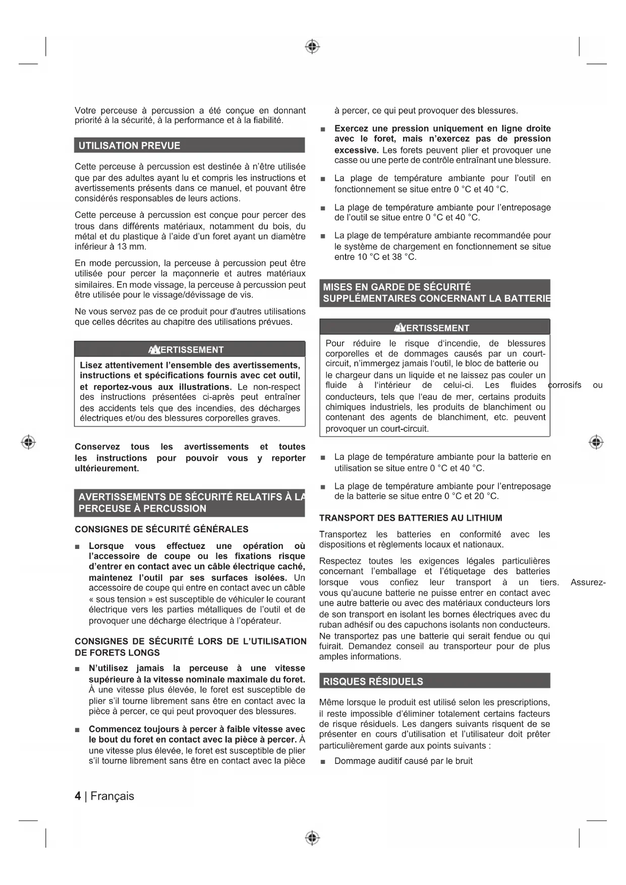 Note Warning Parts or accessories sold separately Torque, maximum Torque, minimum Speed, minimum Speed, maximum The following signal words and meanings are intended to explain the levels of risk associated with this product: DANGER Indicates an imminently hazardous situation, which, if not DYRLGHGZLOOUHVXOWLQGHDWKRUVHULRXVLQMXU\ WARNING Indicates a potentially hazardous situation, which, if not DYRLGHGFRXOGUHVXOWLQGHDWKRUVHULRXVLQMXU\ CAUTION Indicates a potentially hazardous situation, which, if not DYRLGHGPD\UHVXOWLQPLQRURUPRGHUDWHLQMXU\ CAUTION (Without Safety Alert Symbol) Indicates a situation that may result in property damage.4 | Français Votre perceuse à percussion a été conçue en donnant SULRULWpjODVpFXULWpjODSHUIRUPDQFHHWjOD¿DELOLWp UTILISATION PREVUE Cette perceuse à percussion est destinée à n’être utilisée que par des adultes ayant lu et compris les instructions et avertissements présents dans ce manuel, et pouvant être considérés responsables de leurs actions. Cette perceuse à percussion est conçue pour percer des trous dans différents matériaux, notamment du bois, du métal et du plastique à l’aide d’un foret ayant un diamètre inférieur à 13 mm. En mode percussion, la perceuse à percussion peut être utilisée pour percer la maçonnerie et autres matériaux similaires. En mode vissage, la perceuse à percussion peut rWUHXWLOLVpHSRXUOHYLVVDJHGpYLVVDJHGHYLV Ne vous servez pas de ce produit pour d'autres utilisations que celles décrites au chapitre des utilisations prévues. AVERTISSEMENT Lisez attentivement l’ensemble des avertissements, instructions et spécifications fournis avec cet outil, et reportez-vous aux illustrations. Le non-respect des instructions présentées ci-après peut entraîner des accidents tels que des incendies, des décharges pOHFWULTXHVHWRXGHVEOHVVXUHVFRUSRUHOOHVJUDYHV Conservez tous les avertissements et toutes les instructions pour pouvoir vous y reporter ultérieurement.