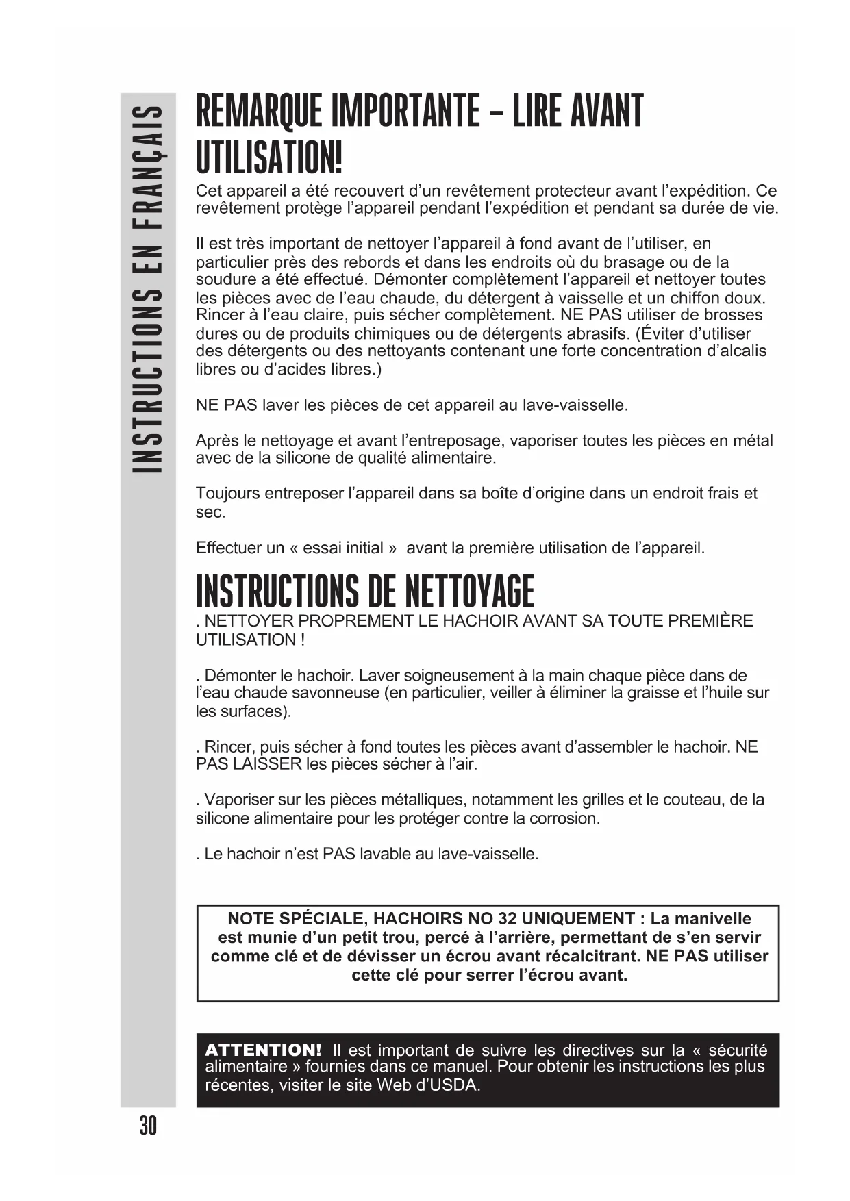 ATTENTION! Il est important de suivre les directives sur la « sécurité alimentaire » fournies dans ce manuel. Pour obtenir les instructions les plus récentes, visiter le site Web d'USDA.