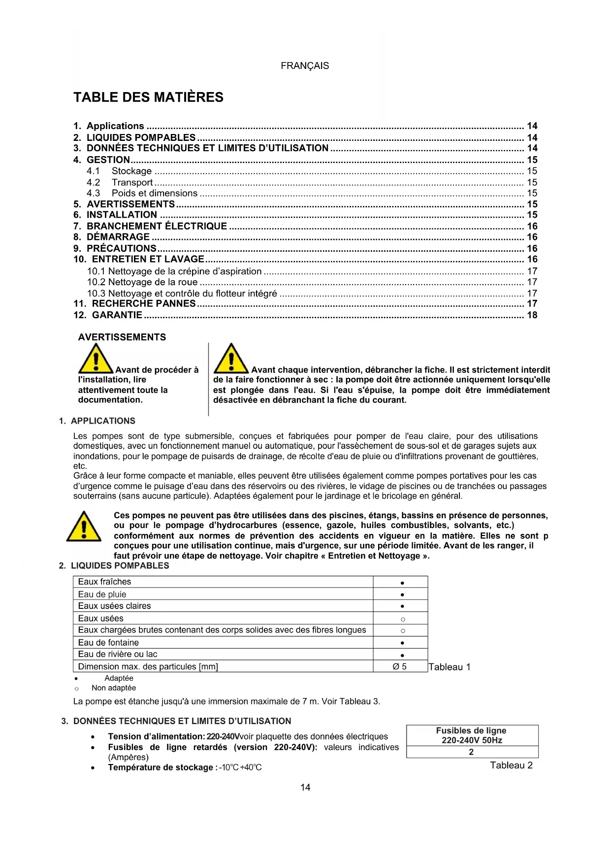 La longueur du câble d’alimentation présent sur la pompe limite la profondeur maximum d’immersion pour l’utilisation de celle-ci. Respecter les indications présentes sur la plaque technique et dans le tableau 3 de ce manuel.