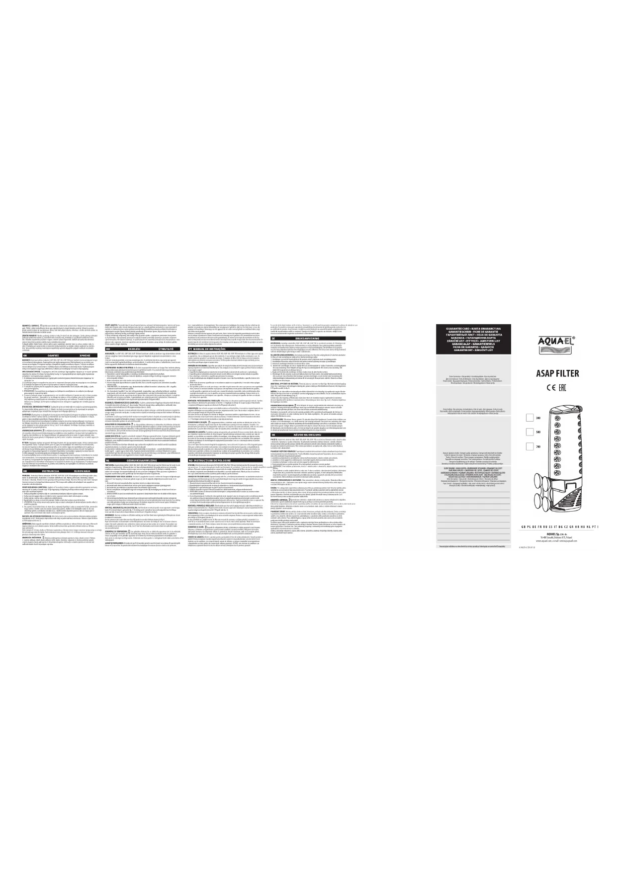 et mentales réduites, ainsi que personnes avec le manque d'expérience et de connaissances de l’équipement, s’ils seront fournis avec la surveillance ou l'instruction concernant l'utilisation de l'équipement de façon sécuritaire et les risques associés. Les enfants ne devraient pas jouer avec l'appareil. Le nettoyage et l'entretien de l'équipement ne doivent pas être effectués par des enfants sans surveillance. INSTALLATION, MISE EN SERVICE ET AJUSTEMENT. Le filtre doit être placé dans un aquarium en position verticale. L’immersion minimale est montrée dans la figure 1. La direction de la sortie d'eau peut être ajustée en tournant le récipient de filtre vers la gauche ou vers la droite dans la plage de 0 à 90 degrés (voir Fig. 5). ENTRETIEN. Afin d'assurer un fonctionnement continu et efficace du filtre, il est nécessaire de nettoyer régulière- ment le récipient de filtre ou le remplacer par des récipients neufs accessoires. Pour retirer le récipient, tournez le vers n’importe quelle direction de 180 degrés (voir Fig. 4). En plus du remplacement ou le nettoyage du récipient de filtre il est également nécessaire de nettoyer régulièrement le rotor et sa chambre (il est recommandé d'effectuer cela au moins une fois toutes les deux semaines). La procédure de retrait du rotor est montrée dans la Fig. 2 et 3. Pour nettoyer la chambre du rotor il est recommandé d'utiliser une brosse douce. DEMONTAGE ET DEMOLITION. Les appareils electromenagers et electroniques uses ne doivent pas etre jetes ala poubelle. Le triage et le recyclage des appareils de ce type contribuent ala preservation de l’environnement. L’utilisateur est responsable d’amener l’appareil use au point de collecte specialise ou l’appareil sera recu gratuite- ment. La liste de ces points de collecte peut etre obtenue aupres des autorites locales ou du vendeur du produit. CONDITIONS DE GARANTIE. Le fabricant accorde une garantie pour une periode de 24 mois acompter de la date de l’achat. La garantie couvre les deteriorations dues aux vices de materiaux et de fabrication, elle ne couvre pas le deteriorations dues au mauvais maniement de l’appareil par l’utilisateur ou al’utilisation autre que celle prevue par le fabricant. Attention: toute tentative de remaniement ou de demontage de l’appareil au dela de l’utilisation et l’entre- tien normal provoquent la decheance de la garantie. Dans le cas de la constatation d’un mauvais fonctionnement de l’appareil, il faut l’envoyer accompagne de la carte de garantie dument remplie al’adresse du fabricant ou du distribu- teur. La condition de la reconnaissance de la garantie est la concordance de la data de fabrication indiquee sur le produit avec la date indiquee sur la carte de garantie. Les conditions de garantie ci-dessus ne limitent pas ni suspendent les droits de l’acheteur decoulant du desaccord entre le produit et le contrat d’achat. La garantie se limite ala reparation ou au remplacement de l’appareil seulement et ne s’applique pas aux pertes ni aux dommages indirects causes aux objets animes ou inanimes. RU ИНСТРУКЦИЯ ПО ЭКСПЛУАТАЦИИ ПРИМЕНЕНИЕ. Внутренние аквариумные фильтры ASAP 300, ASAP 500 и ASAP 700 предназначены для филь- трации воды в аквариуме или акватеррариуме. Данные фильтры характеризуются высокой производитель- ностью, а простота их конструкции облегчает установку и обслуживание. Современные моторы отличаются низким энергопотреблением. Корпус фильтра легко чистится и заменяется (сменные корпусы фильтра приоб- ретаются дополнительно). Благодаря тому, что фильтры могут работать в мелкой воде, они идеально подходят для очистки воды в акватеррариумах. УСЛОВИЯ БЕЗОПАСНОЙ ЭКСПЛУАТАЦИИ. Приобретенное Вами устройство изготовлено в соответствии снор- мами безопасности, действующими встранах Европейского Союза. Чтобы обеспечить долгосрочную и без опас- ную эксплуатацию изделия, обязательно ознакомьтесь со следующими условиями безопасности: