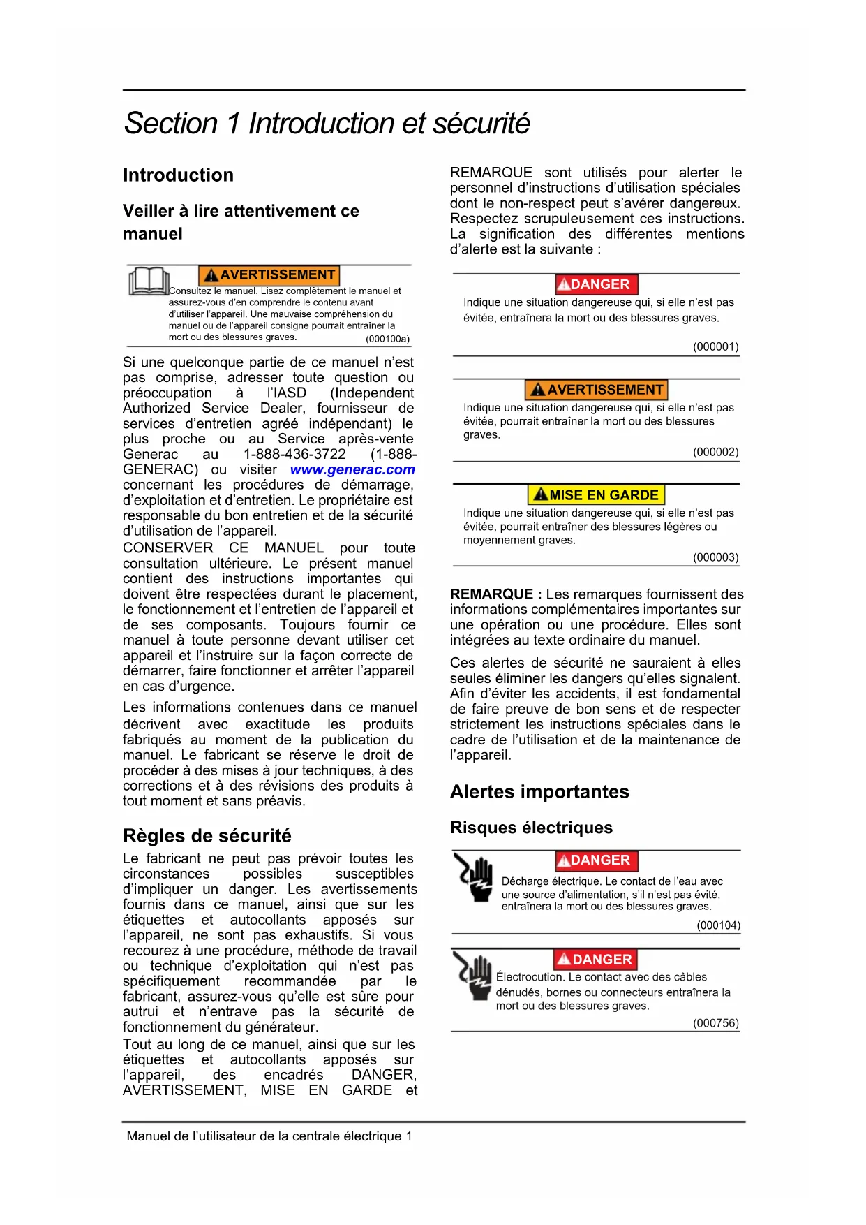 Si une quelconque partie de ce manuel n'est pas comprise, adresser toute question ou préoccupation à l'IASD (Independent Authorized Service Dealer, fournisseur de services d'entretien agréé indépendant) le plus proche ou au Service après-vente Generac au 1-888-436-3722 (1-888-GENERAC) ou visiter www.generac.com concernant les procédures de démarrage, d'exploitation et d'entretien. Le propriétaire est responsable du bon entretien et de la sécurité d'utilisation de l'appareil.