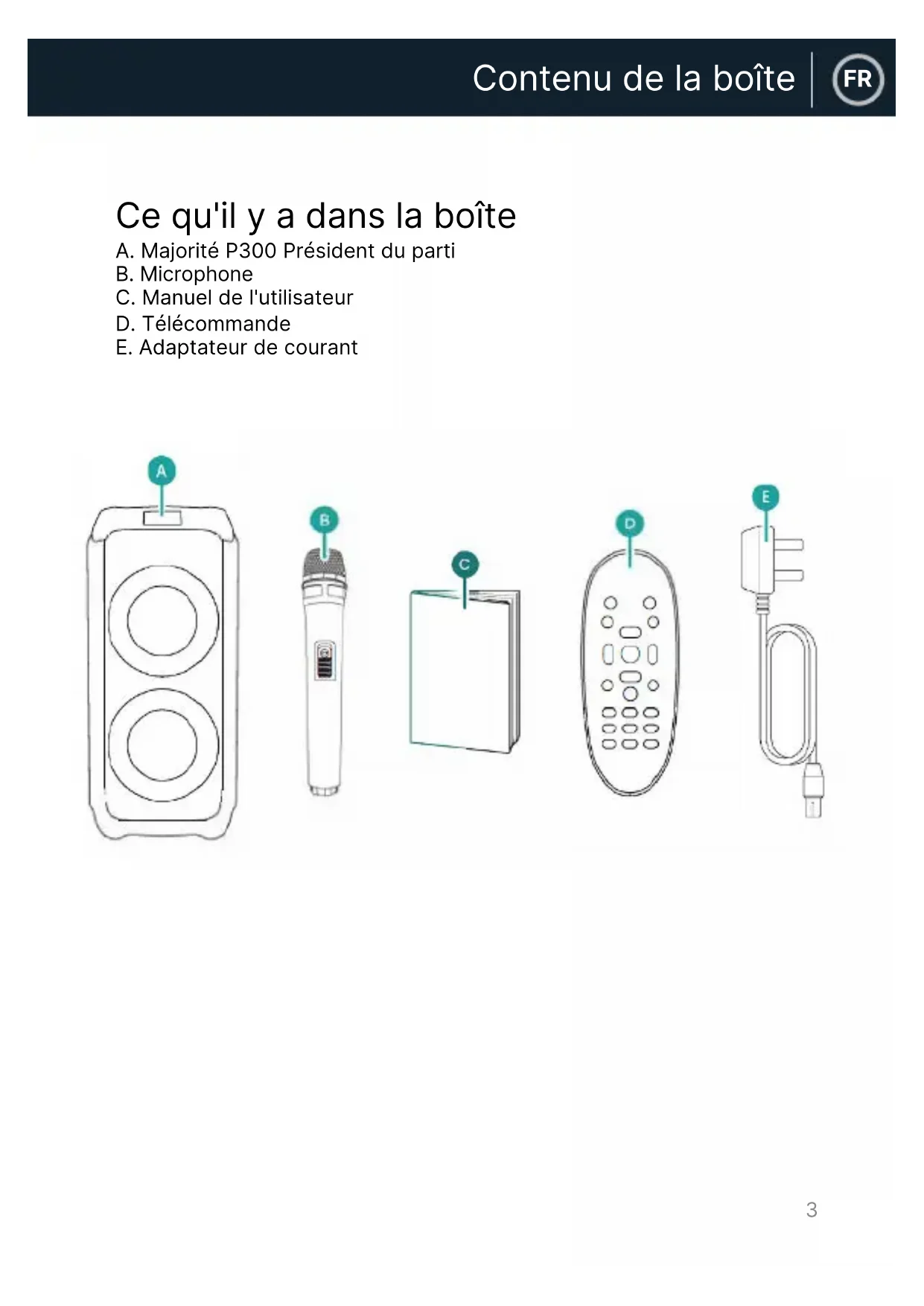 FRContenu de la boîte Ce qu'il y a dans la boîte A. Majorité P300 Président du parti B. Microphone C. Manuel de l'utilisateur D. Télécommande E. Adaptateur de courant