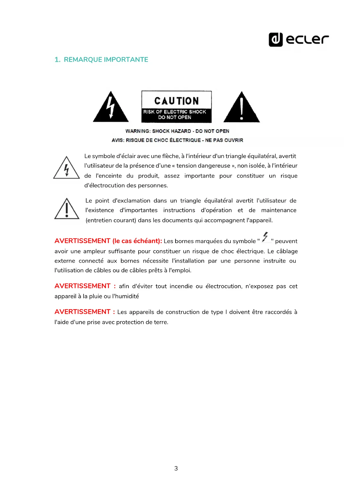 AVERTISSEMENT (le cas échéant): Les bornes marquées du symbole " 3 " peuvent avoir une ampleur suffisante pour constituer un risque de chic électrique. Le câblage externe connecté aux bornes nécessite l'installation par une personne instructue ou l'utilisation de cables ou de cables prêts à l'emploi.