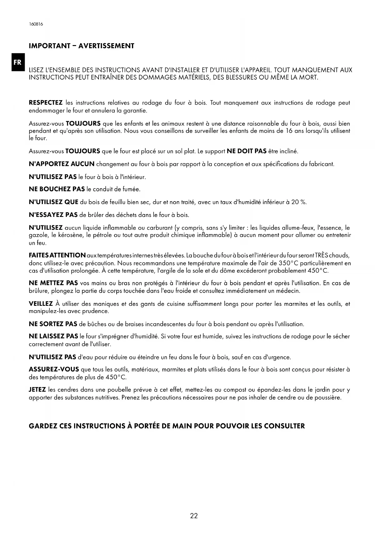 IMPORTANT – AVERTISSEMENT LISEZ L'ENSEMBLE DES INSTRUCTIONS AVANT D'INSTALLER ET D'UTILISER L'APPAREIL TOUT MANQUEMENT AUX INSTRUCTIONS PEUT ENTRAÎNER DES DOMMAGES MATÉRIELS, DES BLESSURES OU MÊME LA MORT RESPECTEZ les instructions relatives au rodage du four à bois Tout manquement aux instructions de rodage peut endommager le four et annulera la garantie Assurez-vous TOUJOURS que les enfants et les animaux restent à une distance raisonnable du four à bois, aussi bien pendant et qu'après son utilisation Nous vous conseillons de surveiller les enfants de moins de 16ans lorsqu'ils utilisent le four Assurez-vous TOUJOURS que le four est placé sur un sol plat Le support NE DOIT PAS être incliné N'APPORTEZ AUCUN changement au four à bois par rapport à la conception et aux spécifications du fabricant N'UTILISEZ PAS le four à bois à l'intérieur NE BOUCHEZ PAS le conduit de fumée N'UTILISEZ QUE du bois de feuillu bien sec, dur et non traité, avec un taux d'humidité inférieur à20% N'ESSAYEZ PAS de brûler des déchets dans le four à bois N'UTILISEZ aucun liquide inflammable ou carburant (y compris, sans s'y limiter: les liquides allume-feux, l'essence, le gazole, le kérosène, le pétrole ou tout autre produit chimique inflammable) à aucun moment pour allumer ou entretenir un feu FAITES ATTENTION aux températures internes très élevées La bouche du four à bois et l'intérieur du four seront TRÈS chauds, donc utilisez-le avec précaution Nous recommandons une température maximale de l'air de 350°C particulièrement en cas d'utilisation prolongée À cette température, l'argile de la sole et du dôme excéderont probablement 450°C NE METTEZ PAS vos mains ou bras non protégés à l'intérieur du four à bois pendant et après l'utilisation En cas de brûlure, plongez la partie du corps touchée dans l'eau froide et consultez immédiatement un médecin VEILLEZ À utiliser des maniques et des gants de cuisine suffisamment longs pour porter les marmites et les outils, et manipulez-les avec prudence NE SORTEZ PAS de bûches ou de braises incandescentes du four à bois pendant ou après l'utilisation NE LAISSEZ PAS le four s'imprégner d'humidité Si votre four est humide, suivez les instructions de rodage pour le sécher correctement avant de l'utiliser N'UTILISEZ PAS d'eau pour réduire ou éteindre un feu dans le four à bois, sauf en cas d'urgence ASSUREZ-VOUS que tous les outils, matériaux, marmites et plats utilisés dans le four à bois sont conçus pour résister à des températures de plus de 450°C JETEZ les cendres dans une poubelle prévue à cet effet, mettez-les au compost ou épandez-les dans le jardin pour y apporter des substances nutritives Prenez les précautions nécessaires pour ne pas inhaler de cendre ou de poussière GARDEZ CES INSTRUCTIONS À PORTÉE DE MAIN POUR POUVOIR LES CONSULTER