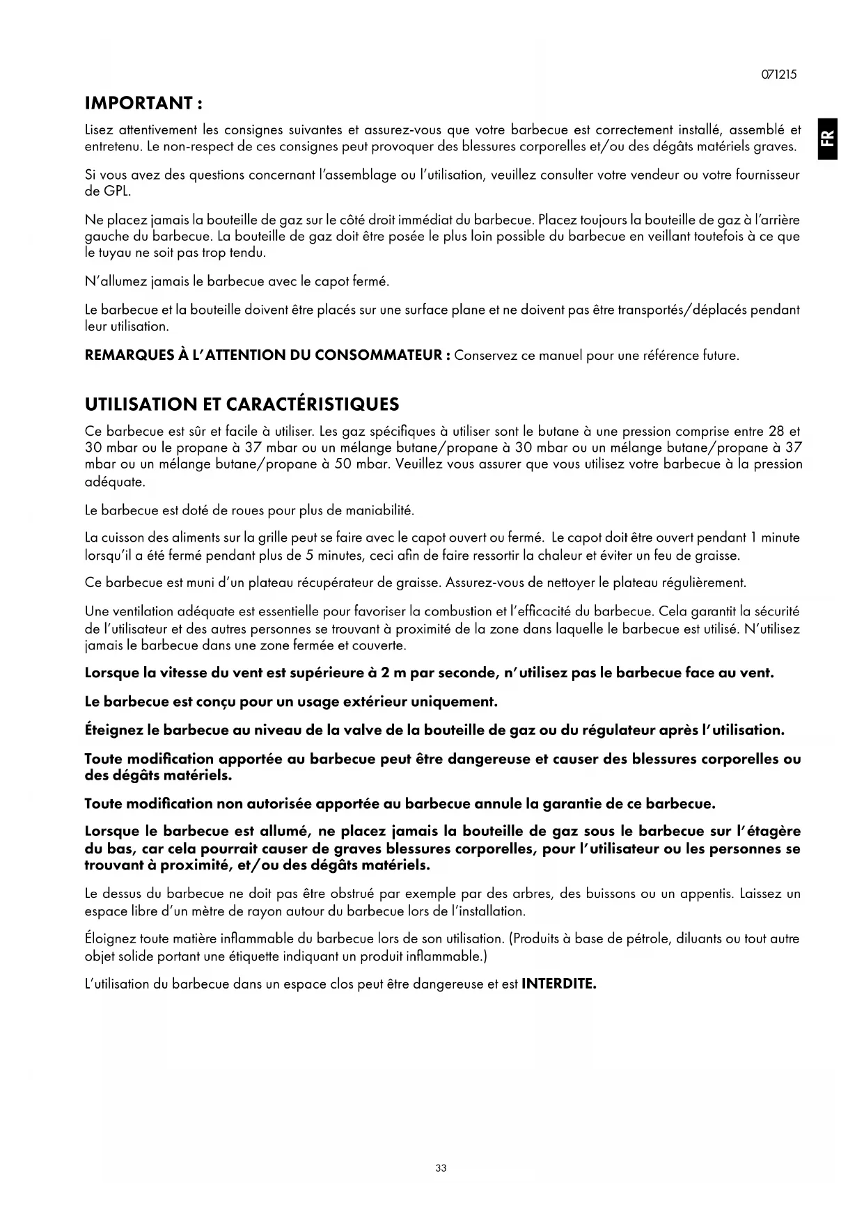 Ce barbecue est sûr et facile à utiliser. Les gaz spécifiques à utiliser sont le butane à une pression comprise entre 28 et 30 mbar ou le propane à 37 mbar ou un mélange butane/propane à 30 mbar ou un mélange butane/propane à 37 mbar ou un mélange butane/propane à 50 mbar. Veuillez vous assurer que vous utilisez votre barbecue à la pression adéquate. Le barbecue est doté de roues pour plus de maniabilité. La cuisson des aliments sur la grille peut se faire avec le capot ouvert ou fermé. Le capot doit être ouvert pendant 1 minute lorsqu’il a été fermé pendant plus de 5 minutes, ceci afin de faire ressortir la chaleur et éviter un feu de graisse. Ce barbecue est muni d’un plateau récupérateur de graisse. Assurez-vous de nettoyer le plateau régulièrement. Une ventilation adéquate est essentielle pour favoriser la combustion et l’efficacité du barbecue. Cela garantit la sécurité de l’utilisateur et des autres personnes se trouvant à proximité de la zone dans laquelle le barbecue est utilisé. N’utilisez jamais le barbecue dans une zone fermée et couverte. Lorsque la vitesse du vent est supérieure à 2 m par seconde, n’utilisez pas le barbecue face au vent. Le barbecue est conçu pour un usage extérieur uniquement. Éteignez le barbecue au niveau de la valve de la bouteille de gaz ou du régulateur après l’utilisation. Toute modification apportée au barbecue peut être dangereuse et causer des blessures corporelles ou des dégâts matériels. Toute modification non autorisée apportée au barbecue annule la garantie de ce barbecue. Lorsque le barbecue est allumé, ne placez jamais la bouteille de gaz sous le barbecue sur l’étagère du bas, car cela pourrait causer de graves blessures corporelles, pour l’utilisateur ou les personnes se trouvant à proximité, et/ou des dégâts matériels. Le dessus du barbecue ne doit pas être obstrué par exemple par des arbres, des buissons ou un appentis. Laissez un espace libre d’un mètre de rayon autour du barbecue lors de l’installation. Éloignez toute matière inflammable du barbecue lors de son utilisation. (Produits à base de pétrole, diluants ou tout autre objet solide portant une étiquette indiquant un produit inflammable.) L’utilisation du barbecue dans un espace clos peut être dangereuse et est INTERDITE. FR34