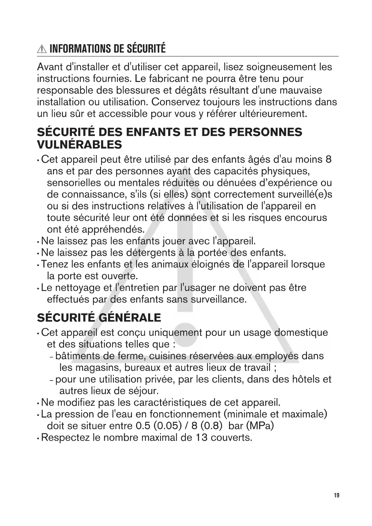 - Respectez le nombre maximal de 13 couverts. 19• Si le câble d'alimentation est endommagé, il doit être remplacé par le fabricant, un service de maintenance agréé ou un technicien qualifié afin d'éviter tout danger.