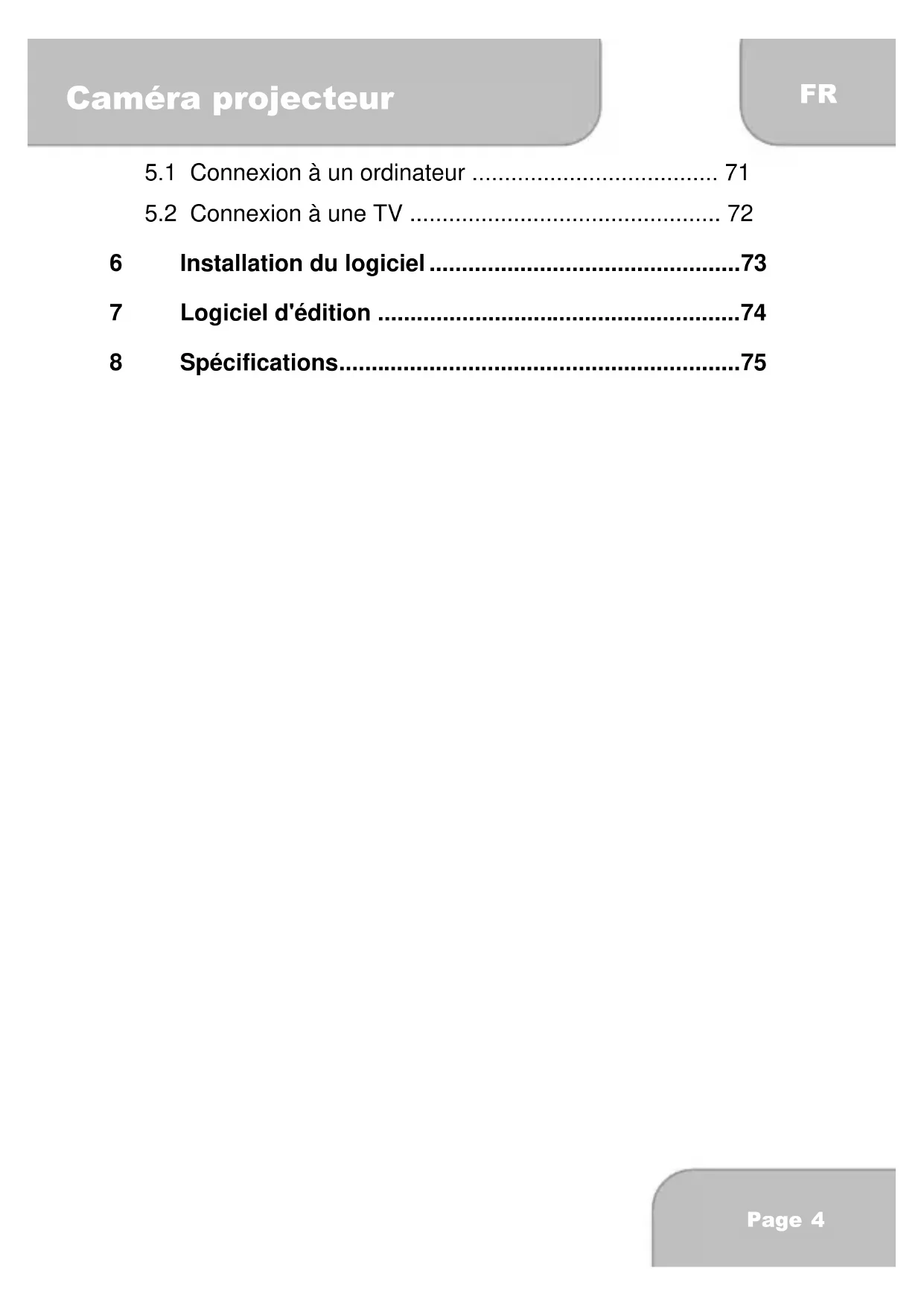 l'appareil via la TV. Remarque : 1. La position synchronisée dépend du mode du caméscope numérique en cours (vidéo ou appareil photo). Ces deux modes ne peuvent pas être interchangées. 2. En mode HDMI, vous ne pouvez pas utiliser le caméscope numérique pour enregistrer des vidéos, prendre des photos, utiliser la fonction du Zoom num. ou lire des vidéos au ralenti. 3. Veillez à ce que le caméscope numérique soit allumé avant de connecter le câble HDMI à la TV. 4. Pour la sortie HDMI/AV, la définition peut être définie en tant que FHD ou HD 30.Page 73 Caméra projecteur