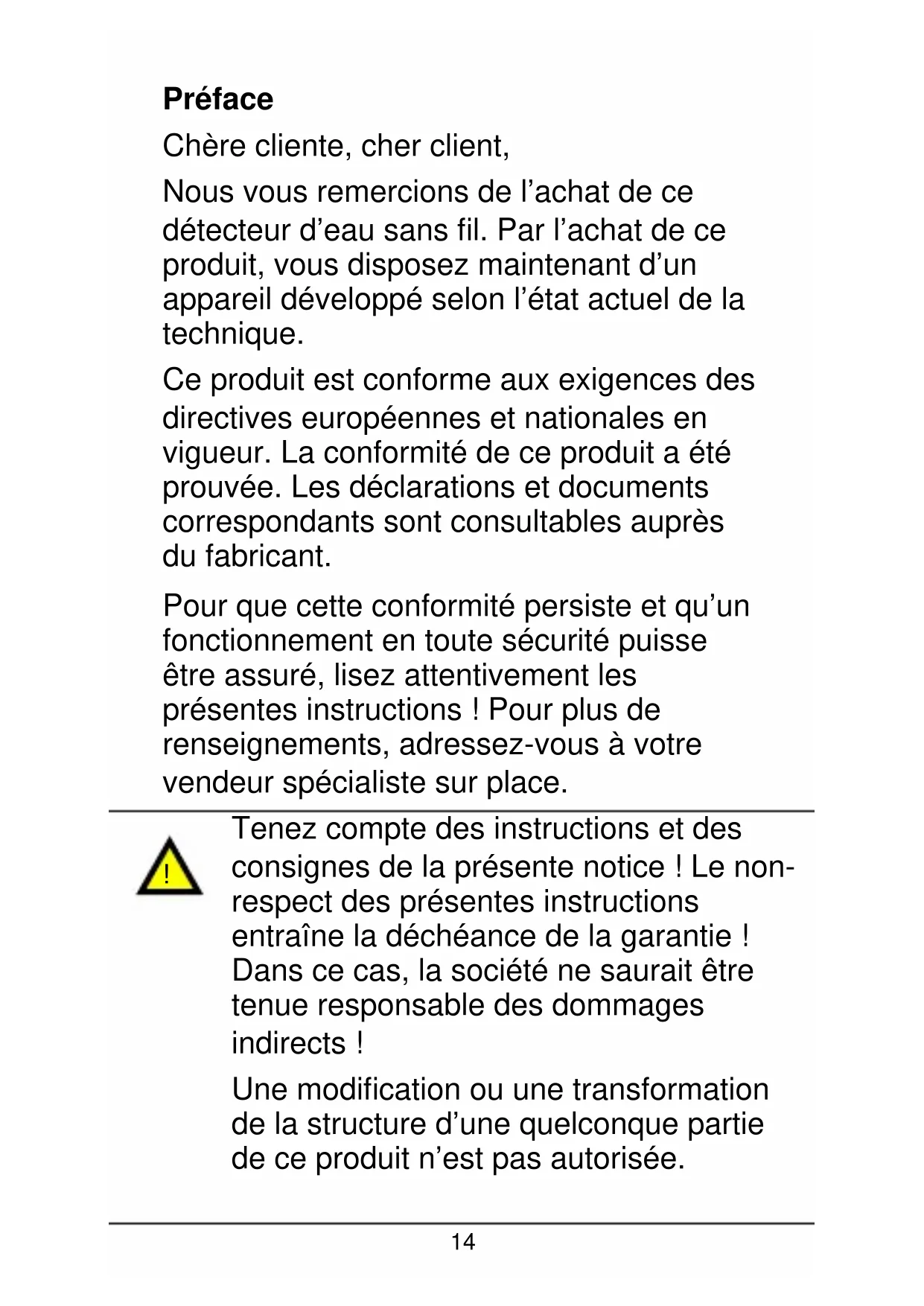 Nous vous remercions de l'achat de ce détecteur d'eau sans fil. Par l'achat de ce produit, vous disposezMAINANT d'un apparéil développé selon l'état actuel de la technique.