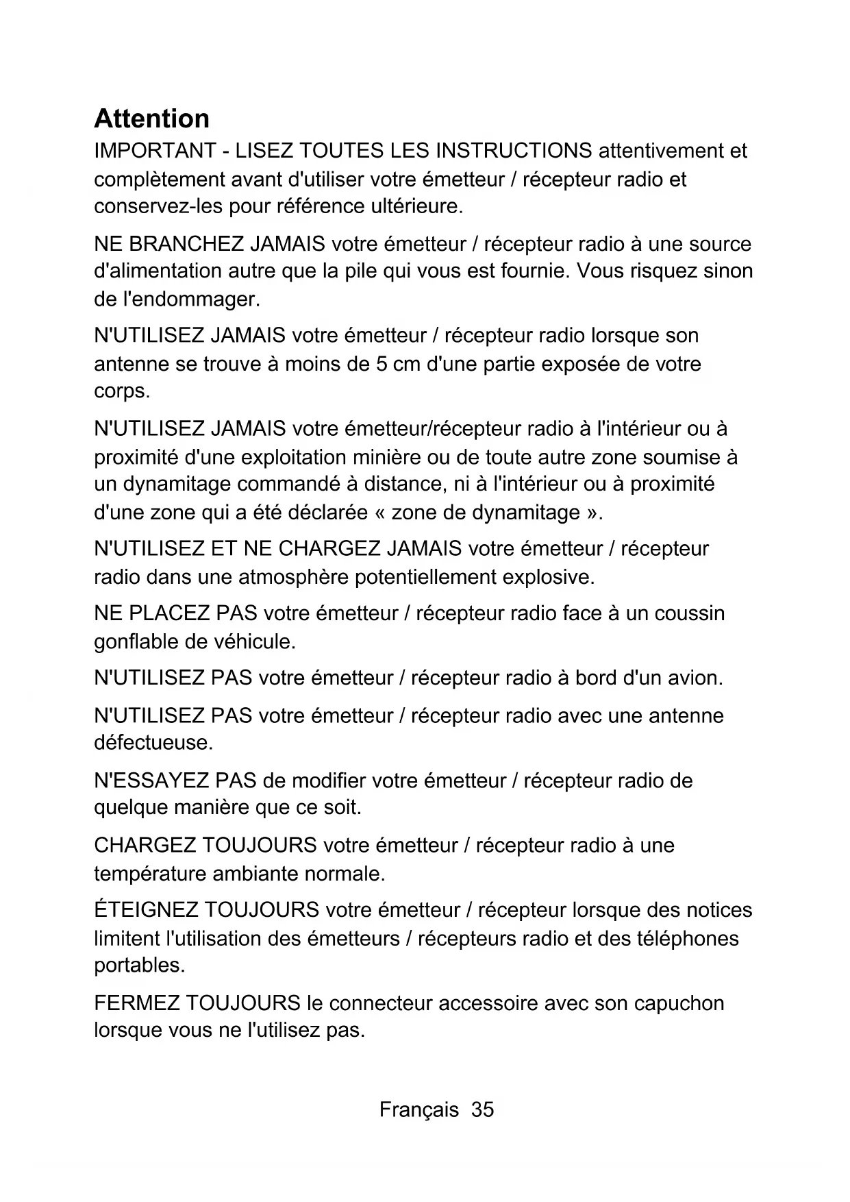 - Spécifications techniques Français 35 Attention IMPORTANT - LISEZ TOUTES LES INSTRUCTIONS attentivement et complètement avant d'utiliser votre émetteur / récepteur radio et conservez-les pour référence ultérieure. NE BRANCHEZ JAMAIS votre émetteur / récepteur radio à une source d'alimentation autre que la pile qui vous est fournie. Vous risquez sinon de l'endommager. N'UTILISEZ JAMAIS votre émetteur / récepteur radio lorsque son antenne se trouve à moins de 5 cm d'une partie exposée de votre corps. N'UTILISEZ JAMAIS votre émetteur/récepteur radio à l'intérieur ou à proximité d'une exploitation minière ou de toute autre zone soumise à un dynamitage commandé à distance, ni à l'intérieur ou à proximité d'une zone qui a été déclarée « zone de dynamitage ». N'UTILISEZ ET NE CHARGEZ JAMAIS votre émetteur / récepteur radio dans une atmosphère potentiellement explosive. NE PLACEZ PAS votre émetteur / récepteur radio face à un coussin gonflable de véhicule. N'UTILISEZ PAS votre émetteur / récepteur radio à bord d'un avion. N'UTILISEZ PAS votre émetteur / récepteur radio avec une antenne défectueuse. N'ESSAYEZ PAS de modifier votre émetteur / récepteur radio de quelque manière que ce soit. CHARGEZ TOUJOURS votre émetteur / récepteur radio à une température ambiante normale. ÉTEIGNEZ TOUJOURS votre émetteur / récepteur lorsque des notices limitent l'utilisation des émetteurs / récepteurs radio et des téléphones portables. FERMEZ TOUJOURS le connecteur accessoire avec son capuchon lorsque vous ne l'utilisez pas.36 Français PLACEZ UNIQUEMENT des piles rechargeables agréées par ALBRECHT dans le chargeur qui vous est fourni. ÉVITEZ de charger votre émetteur / récepteur radio ou la pile lorsque l'un ou l'autre est humide. ÉVITEZ de ranger ou charger votre émetteur / récepteur radio dans un endroit l'exposant directement aux rayons du soleil. ÉVITEZ de ranger ou d'utiliser votre émetteur / récepteur radio dans un endroit où la température est inférieure à -20 °C ou supérieure à +60 °C. Consultez les informations par pays rapportées sur l'emballage et publiées sur notre serveur Internet service.alan-electronics.de. p. 48