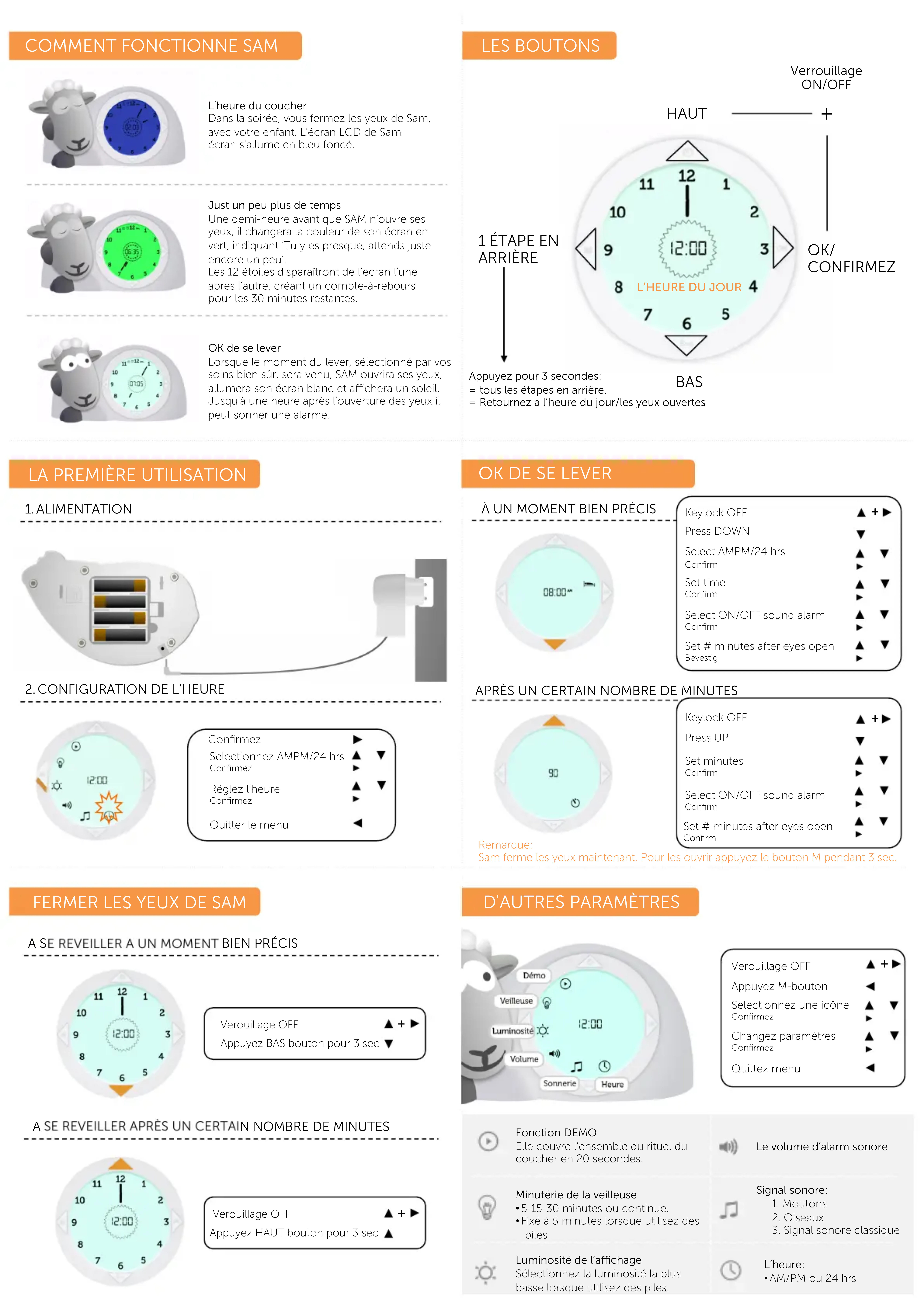 Q. Existe-t-il une fonction démo pour montrer à mon enfant le fonctionnement de SAM? A. Oui, cette démo se trouve dans le menu de configuration. Elle couvre l'ensemble du rituel du coucher en environ 20 secondes. Q. Comment puis-je savoir si mon horloge est activée? A. En haut de l'écran LCD vous verrez les symboles des fonctions activées, que ce soit le symbole de l'heure du coucher ou de l'heure du réveil, avec en option le symbole du signal sonore. Q. Comment puis-je voir si l'horloge est verrouillée? A. Dans la partie supérieure de l'écran LCD le symbole de verrouillage apparaîtra quand il sera activé. Q. SAM n'ouvre pas ses yeux à l'heure du réveil. A. Les piles sont certainement épuisées. N'utilise que des piles alcalines neuves. Q. Si je ne souhaite pas que le signal sonore retentisse, ai-je besoin de modifier le volume dans le menu de configuration? A. Non, ce n'est pas nécessaire. En activant l'horloge, vous pouvez éteindre ou allumer le signal avec ON ou OFF.
