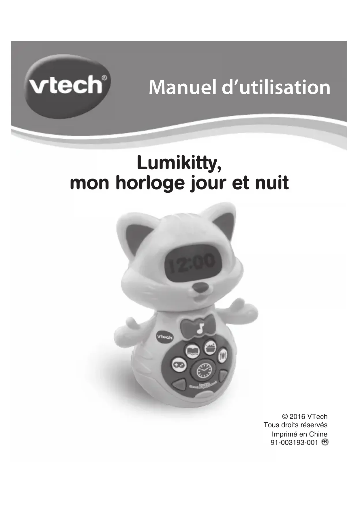 Manuel d’utilisation Lumikitty, mon horloge jour et nuitChers parents, Chez VTech®, nous sommes conscients que les enfants sont notre avenir. C’est pourquoi tous nos jeux sont conçus de manière à entretenir et à renforcer leur désir d’apprendre. Toute la technologie et le sens de la pédagogie VTech