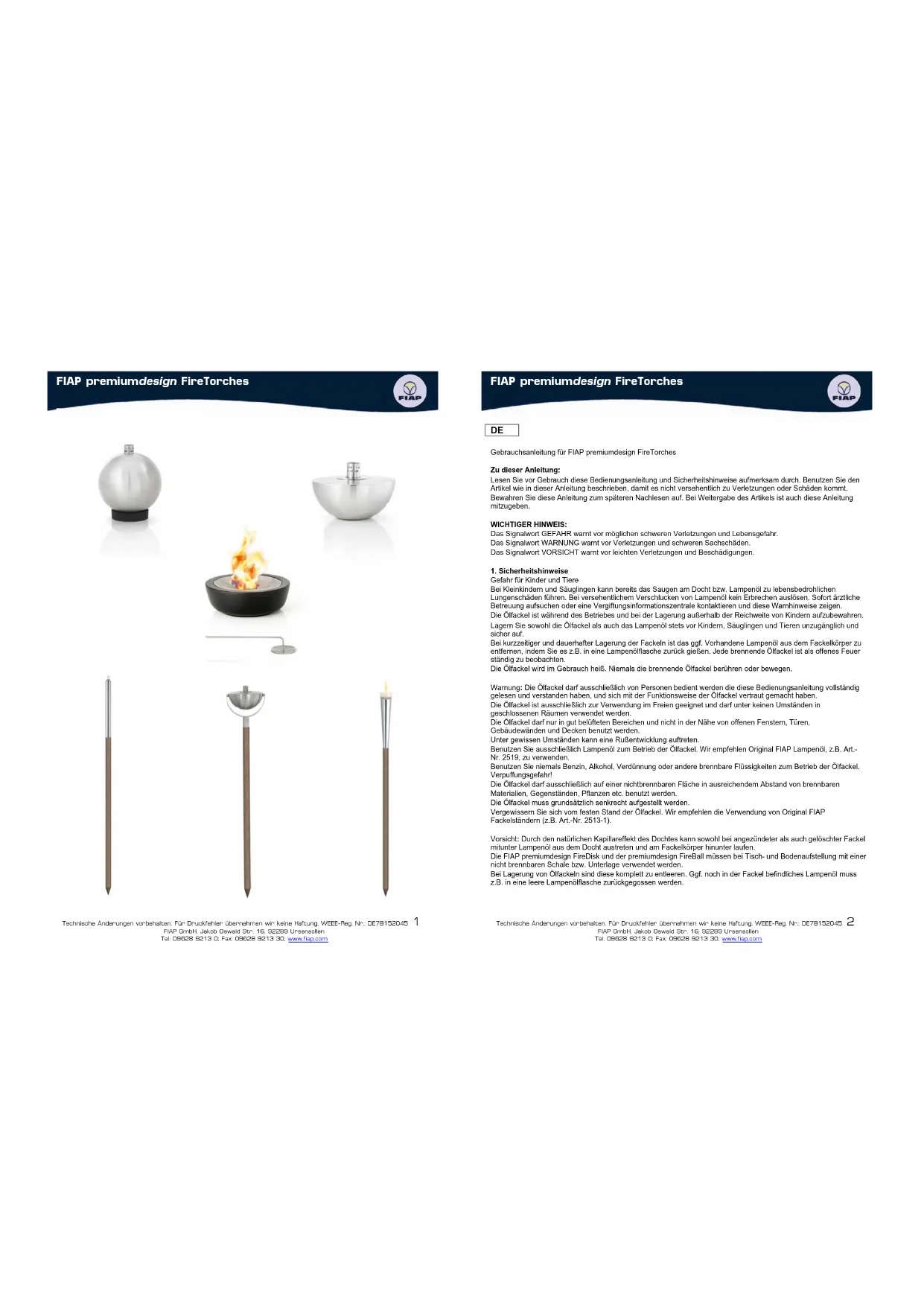 AVERTISSEMENT: La torque ne peut être exploité par une personne qui a lu et compris ces instructions correctement et a fait lui-même familiariser avec le mode de fonctionnement de la torque. La torque est uniquement destinée à un usage extérieur. La torque ne doit pas être utilisée dans une pièce ou un bâtiment fermé. La torque doit être utilisée uniquement dans des endroits bien ariés et loin des fonctions, portes, murs et toitlures. Dans certains circonstances, la suite peut se développer. Utiliser uniquement de l'huile de la lampe pour faire fonctionner la torque. Nous给您 recommendons d'utiliser l'original FIAP LampGel, art. -