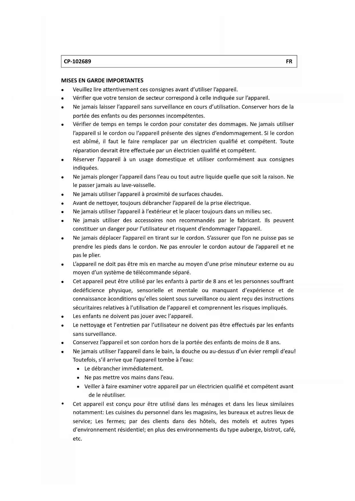 - Cet apparéil est conçu pour être utilisé dans les menages et dans les lieux similaires notamment: Les cuisines du personnel dans les magasins, les bureaux et autres lieux de service; Les fermes; par des clients dans des hotels, des motelels et autres types d'environnement résidentiel; en plus des environnements du type auberge, bistrot, café, etc.
