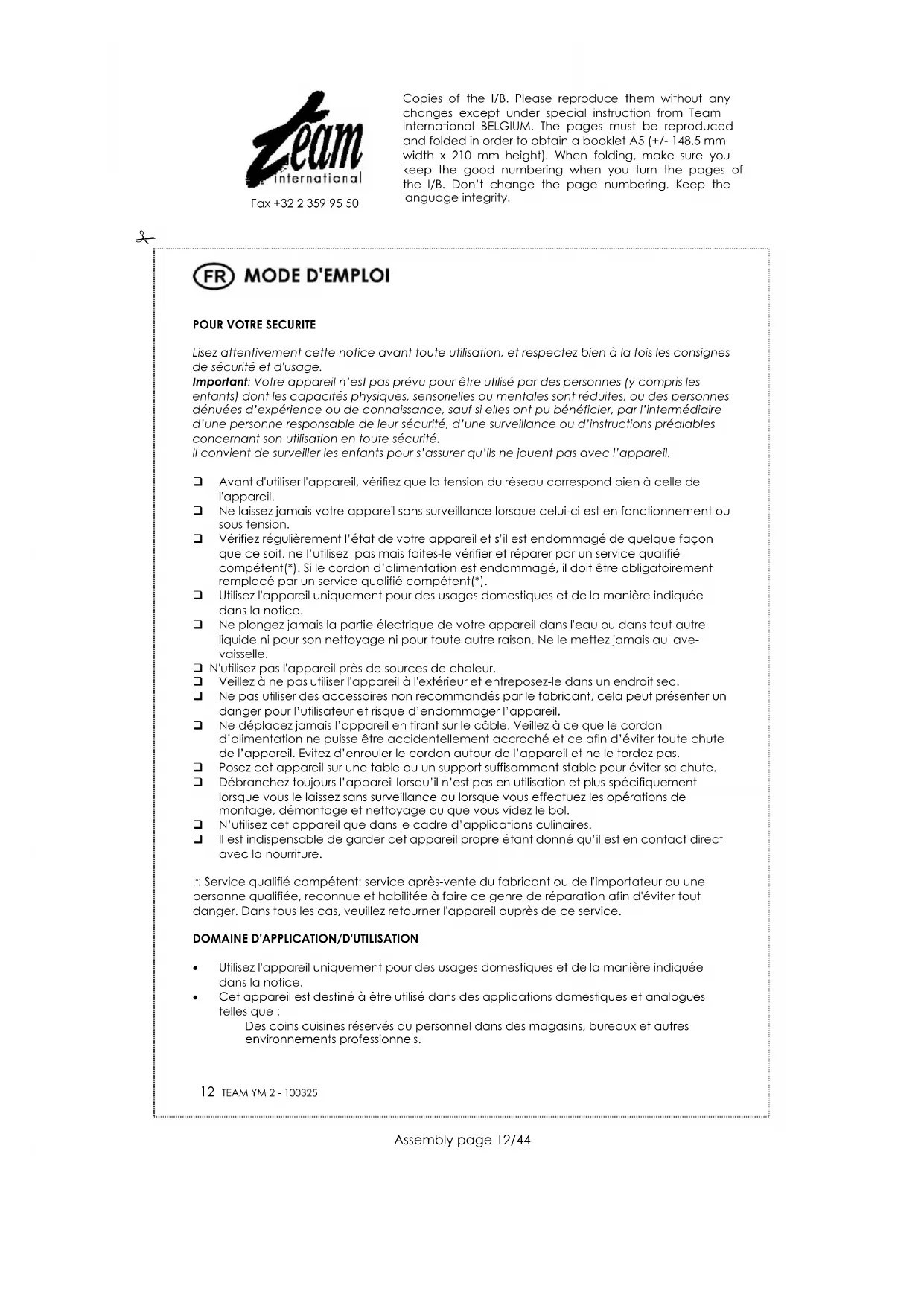 Afin de préserver notre environnement et notre santé, l’élimination en fin de vie des appareils électriques et électroniques doit se faire selon des règles bien précises et nécessite l’implication de chacun, qu’il soit fournisseur ou utilisateur. C’est pour cette raison que votre appareil, tel que le signale le symbole apposé sur sa plaque signalétique ou sur l'emballage, ne doit en aucun cas être jeté dans une poubelle publique ou privée destinée aux ordures ménagères. L'utilisateur a le droit de déposer l'appareil gratuitement dans des lieux publics de collecte procédant à un tri sélectif des déchets pour être soit recyclé, soit réutilisé pour d’autres applications conformément à la directive. Copies of the I/B. Please reproduce them without any changes except under special instruction from Team International BELGIUM. The pages must be reproduced and folded in order to obtain a booklet A5 (+/- 148.5 mm width x 210 mm height). When folding, make sure you keep the good numbering when you turn the pages of the I/B. Don’t change the page numbering. Keep the language integrity.