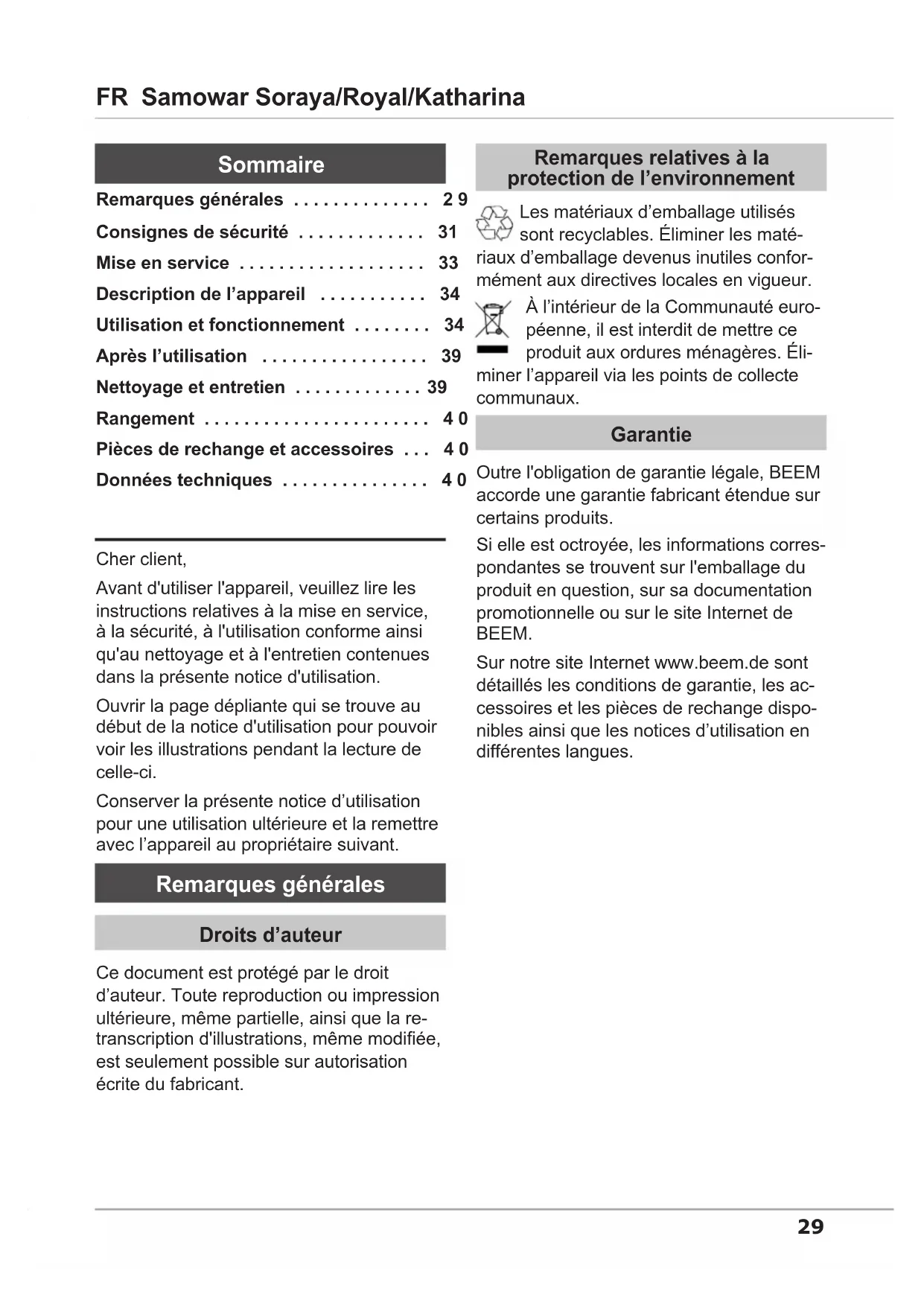- Water tank capacity 10.0 l 15.0 l 15.0 l Protection class I Degree of protection IPX029 FR Samowar Soraya/Royal/Katharina Cher client, Avant d'utiliser l'appareil, veuillez lire les instructions relatives à la mise en service, à la sécurité, à l'utilisation conforme ainsi qu'au nettoyage et à l'entretien contenues dans la présente notice d'utilisation. Ouvrir la page dépliante qui se trouve au début de la notice d'utilisation pour pouvoir voir les illustrations pendant la lecture de celle-ci. Conserver la présente notice d’utilisation pour une utilisation ultérieure et la remettre avec l’appareil au propriétaire suivant. Remarques générales Droits d’auteur Ce document est protégé par le droit d’auteur. Toute reproduction ou impression ultérieure, même partielle, ainsi que la re- transcription d'illustrations, même modiée, est seulement possible sur autorisation écrite du fabricant. Remarques relatives à la protection de l’environnement Les matériaux d’emballage utilisés sont recyclables. Éliminer les maté- riaux d’emballage devenus inutiles confor- mément aux directives locales en vigueur. À l’intérieur de la Communauté euro- péenne, il est interdit de mettre ce produit aux ordures ménagères. Éli- miner l’appareil via les points de collecte communaux. Garantie Outre l'obligation de garantie légale, BEEM accorde une garantie fabricant étendue sur certains produits. Si elle est octroyée, les informations corres- pondantes se trouvent sur l'emballage du produit en question, sur sa documentation promotionnelle ou sur le site Internet de BEEM. Sur notre site Internet www.beem.de sont détaillés les conditions de garantie, les ac- cessoires et les pièces de rechange dispo- nibles ainsi que les notices d’utilisation en différentes langues. Remarques générales p. 29