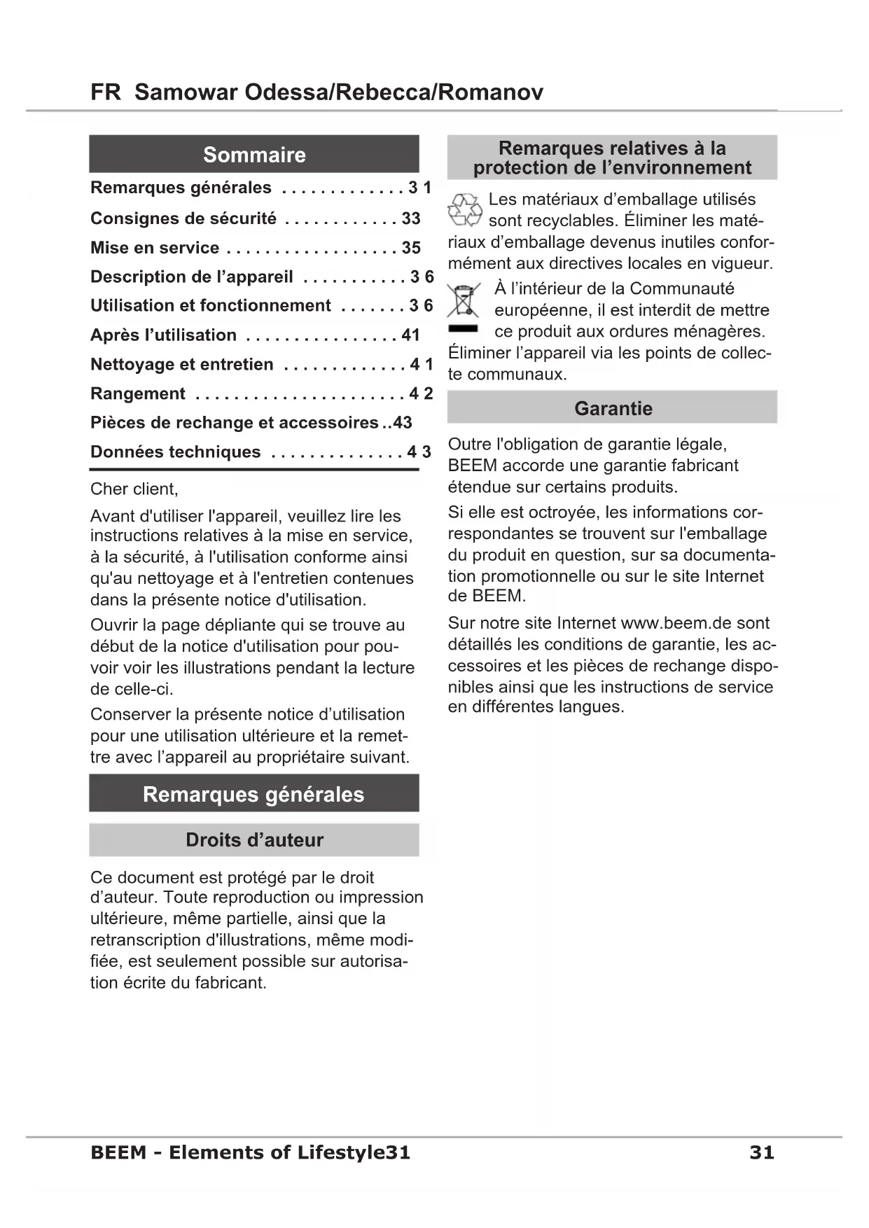 - Operating voltage 230 V~ Mains frequency 50-60 Hz Power consumption 1300 W + 500 W Teapot capacity 1.0 l 1.3 l 1.3 l Water tank capacity 3.0 l 5.0 l 5.0 l Protection class I Degree of protection IPX030 Samowar Odessa/Rebecca/Romanov EN BEEM - Elements of Lifestyle31 FR Samowar Odessa/Rebecca/Romanov BEEM - Elements of Lifestyle31 Cher client, Avant d'utiliser l'appareil, veuillez lire les instructions relatives à la mise en service, à la sécurité, à l'utilisation conforme ainsi qu'au nettoyage et à l'entretien contenues dans la présente notice d'utilisation. Ouvrir la page dépliante qui se trouve au début de la notice d'utilisation pour pou- voir voir les illustrations pendant la lecture de celle-ci. Conserver la présente notice d’utilisation pour une utilisation ultérieure et la remet- tre avec l’appareil au propriétaire suivant. Remarques générales Droits d’auteur Ce document est protégé par le droit d’auteur. Toute reproduction ou impression ultérieure, même partielle, ainsi que la retranscription d'illustrations, même modi- ée, est seulement possible sur autorisa- tion écrite du fabricant. Remarques relatives à la protection de l’environnement Les matériaux d’emballage utilisés sont recyclables. Éliminer les maté- riaux d’emballage devenus inutiles confor- mément aux directives locales en vigueur. À l’intérieur de la Communauté européenne, il est interdit de mettre ce produit aux ordures ménagères. Éliminer l’appareil via les points de collec- te communaux. Garantie Outre l'obligation de garantie légale, BEEM accorde une garantie fabricant étendue sur certains produits. Si elle est octroyée, les informations cor- respondantes se trouvent sur l'emballage du produit en question, sur sa documenta- tion promotionnelle ou sur le site Internet de BEEM. Sur notre site Internet www.beem.de sont détaillés les conditions de garantie, les ac- cessoires et les pièces de rechange dispo- nibles ainsi que les instructions de service en différentes langues. Remarques générales p. 31