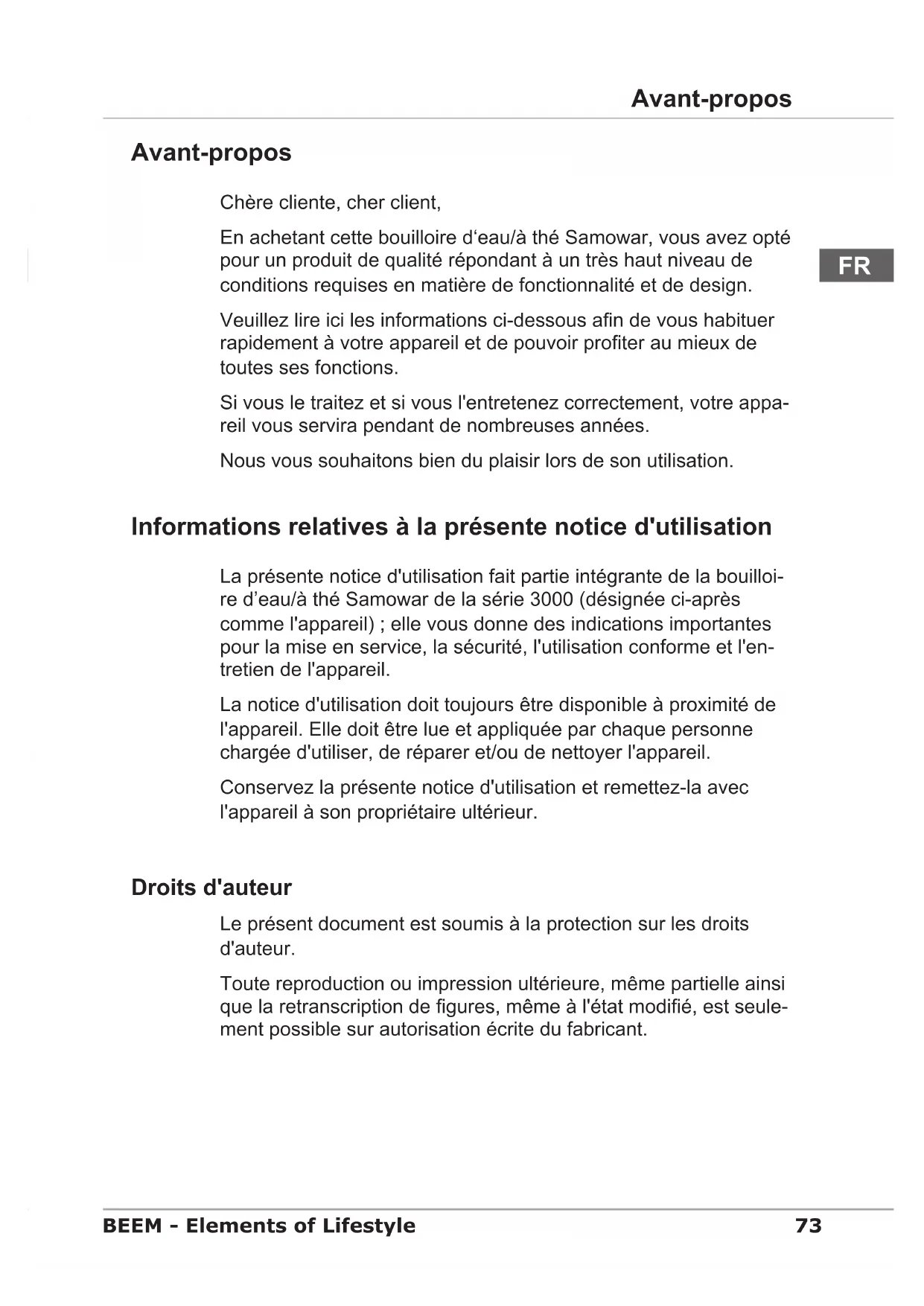 Utilisateur suivant .............73 Utilisation conforme ...........75105 BEEM - Elements of Lifestyle