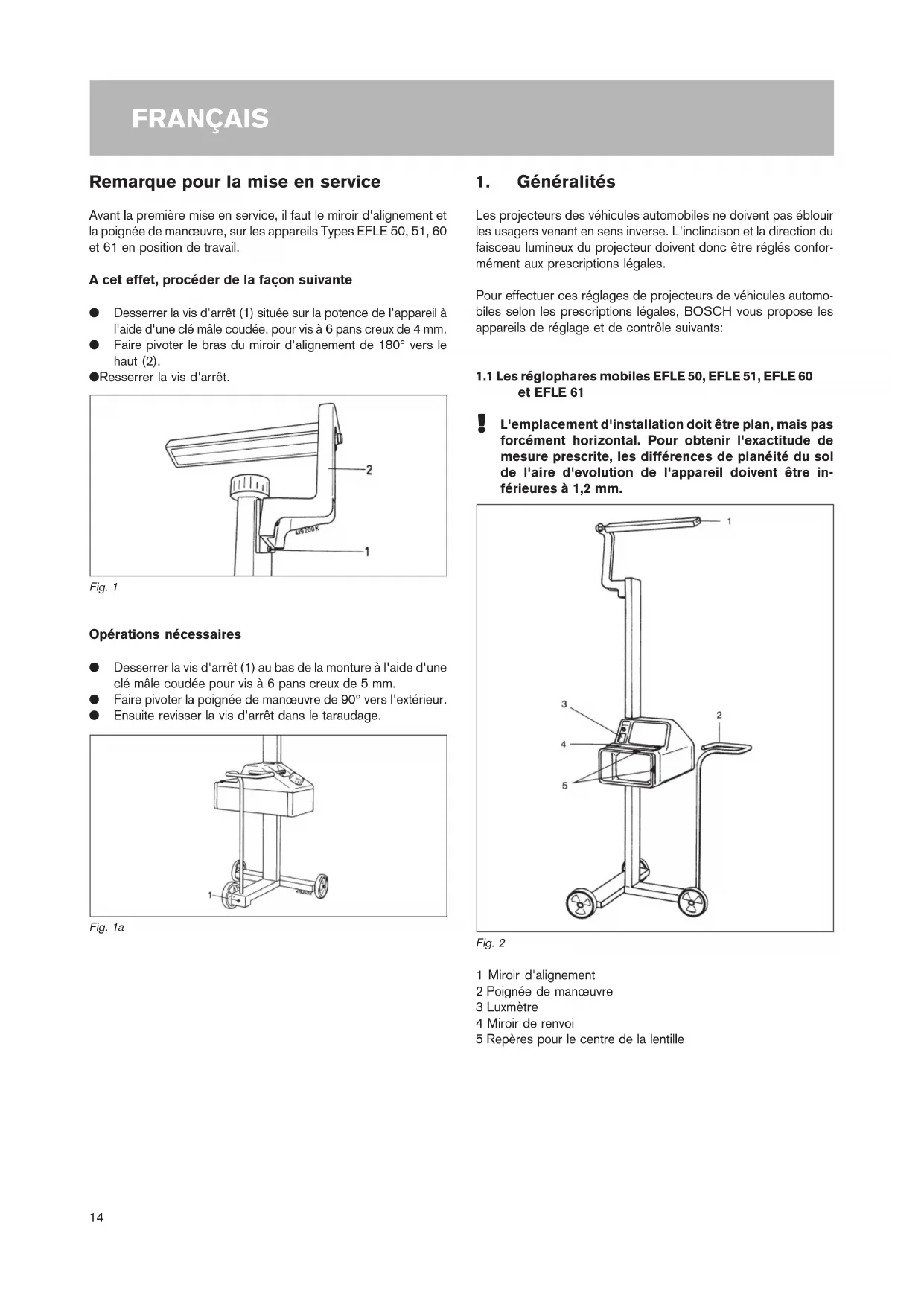 Le réglophare est un appareil optique de mesure de précision. Pour qu'il conserve cette exactitude de mrsure il convient de le protéger des chocs et de la manier avec douceur. Le degré d'exactitude de l'indication doit être vérifié à intervalles bien définis. Cela est particulièrement important pour les ateliers qui exécutent des travaux de réglage suivant les prescriptions légales. Pour la maintenance du réglophare, il est recommandé de passer un contrat d'entretien avec le point d'après-vente Bosch compé- tent. Les vérifications seront alors exécutées par un personnel qualifiè, suivant les prescriptions de l'usine, et au moyen d'appareils de contrôle appropriés. Pour l'entretien, il faut lubrifier les roues de temps à autre avec quelques gouttes d'huile. La colonne de guidage doit être maintenue sèche et exempte de graisse et d'huile. Maintenir la lentille et le miroir propres au moyen d'un chiffon doux.19 ESPAÑOL Indicación para la puesta en servicio Antes de la primera puesta en servicio hay que girar el espejo de alineación y, en los aparatos móviles EFLE 50, 51, 60 y 61 la empuñadura de maniobra, a la posición de trabajo. Manipulaciones necesarias ● Con un destornillador hexagonal acodado de 4 mm, soltar el tornillo de retención contra giro (1), existente en la columma del aparato. ● Girar el brazo del espejo de alineación 180° hacia arriba (2). ● Volver a apretar el tornillo de retención control el giro. Fig. 1 Manipulaciones necesarias ● Con un destornillador hexagonal acodado de 5 mm, soltar el tornillo de retención contra el giro (1), existente en el pie del alineador. ● Girar la empuñadura de maniobra 90°hacia afuera. ● Volver a introducir en su taladro el tornillo de retención contra el giro. Fig. 1a