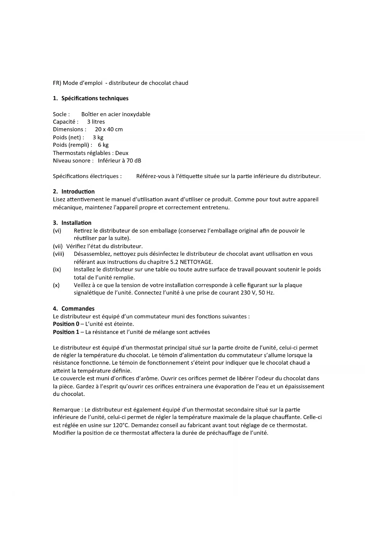 (vi) Retirez le distributeur de son emballage (conservez l’emballage original afin de pouvoir le réutiliser par la suite). (vii) Vérifiez l’état du distributeur. (viii) Désassemblez, nettoyez puis désinfectez le distributeur de chocolat avant utilisation en vous référant aux instructions du chapitre 5.2 NETTOYAGE. (ix) Installez le distributeur sur une table ou toute autre surface de travail pouvant soutenir le poids total de l’unité remplie. (x) Veillez à ce que la tension de votre installation corresponde à celle figurant sur la plaque signalétique de l’unité. Connectez l’unité à une prise de courant 230 V, 50 Hz.