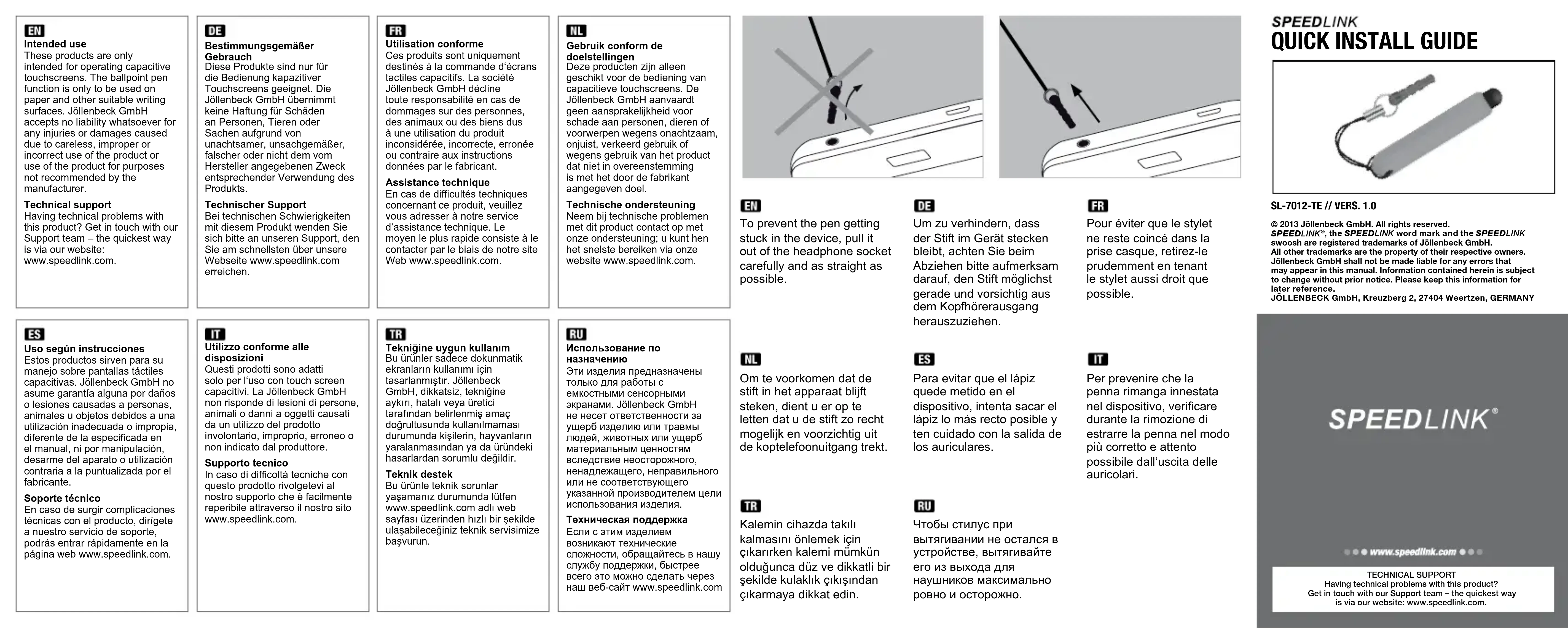 Utilisation conforme Ces produits sont uniquement destinés à la commande d'écrans tactiles capacitifs. La société Jöllenbeck GmbH décline toute responsabilité en cas de dommages sur des personnes, des animaux ou des biens dus à une utilisation du produit inconsidérée, incorrecte, erronée ou contraire aux instructions données par le fabricant. Assistance technique En cas de difficultés techniques concernant ce produit, veuillez vous adresser à notre service d'assistance technique. Le moyen le plus rapide consiste à le contacter par le biais de notre site Web www.speedlink.com.