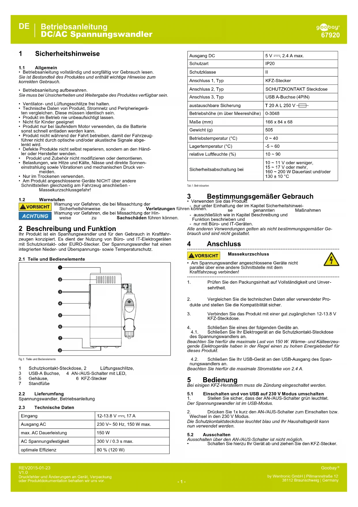 4.1. Connectez votre appareil à la prise de courant de convertisseur de tension. Rappelez-vous ce la charge maximale de 150 W. chaleur et cryogénique Appareils électriques ont généralement une exigence de haute énergie pour ce produit. 4.2. ConnectezvotrepériphériqueUSBàlasortieUSBdeconvertis- seur de tension. Remarque ce courant maximum de 2,4 A.- 6 - Mode d‘emploi Convertisseur de tension DC/AC