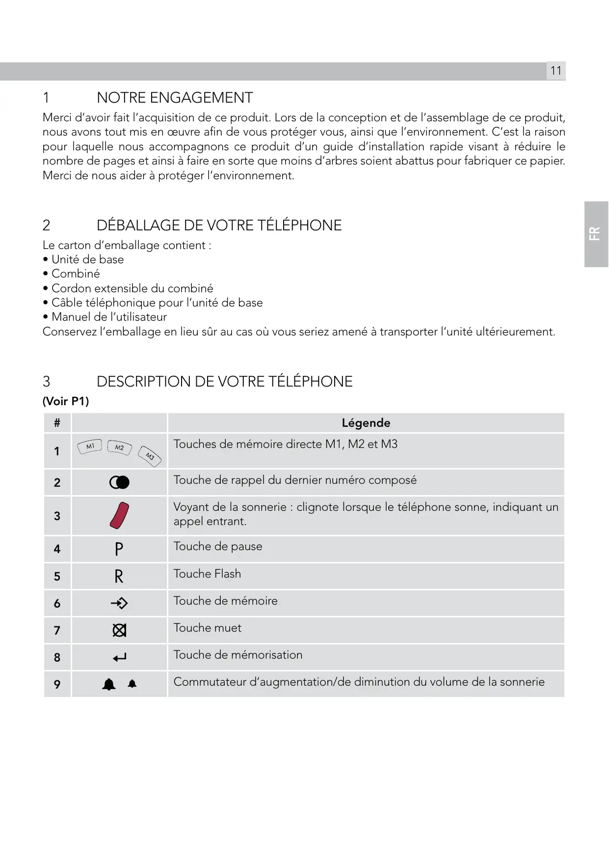 DÉBALLAGE DE VOTRE TÉLÉPHONE Le carton d‘emballage contient : tUnité de base tCombiné tCordon extensible du combiné tCâble téléphonique pour l‘unité de base tManuel de l‘utilisateur Conservez l‘emballage en lieu sûr au cas où vous seriez amené à transporter l‘unité ultérieurement.